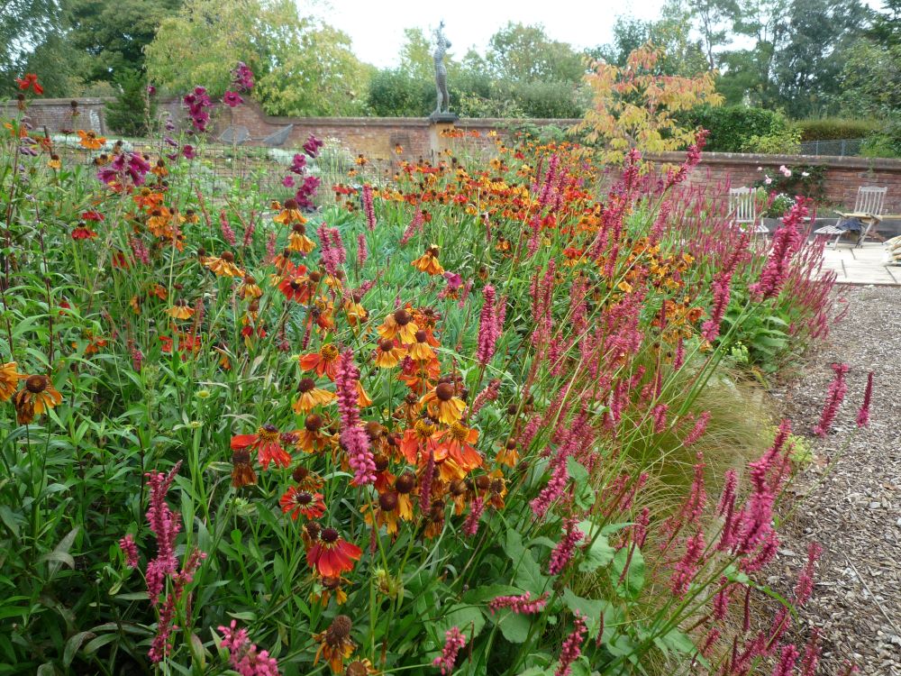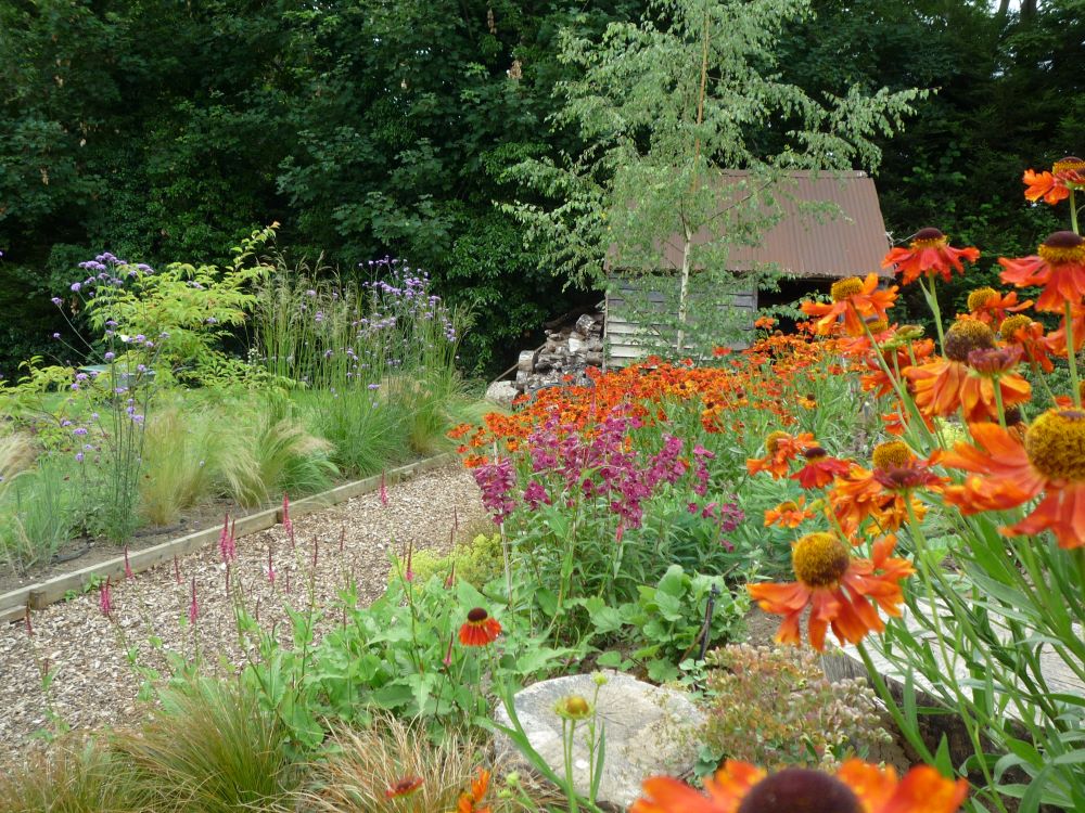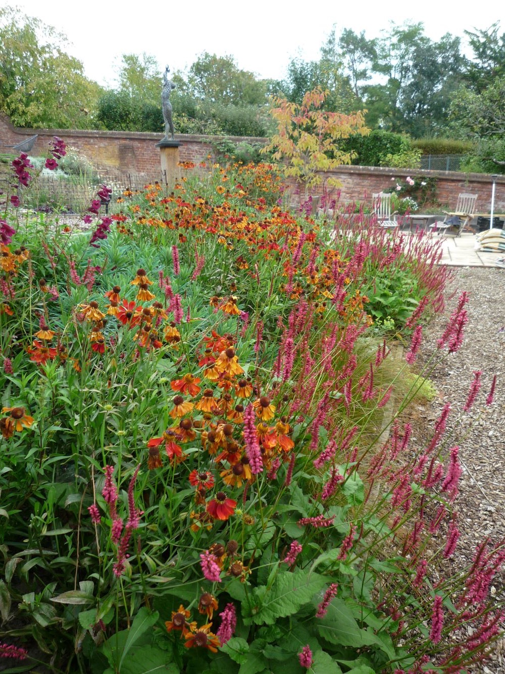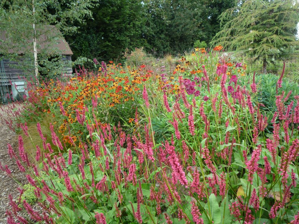 Swathes of Euphorbias, Geums and Tulips start the drama at the start of the season then in summer they give way to exuberant drifts of Heleniums, Persicaria and Penstemons, offset by the acid greens and yellows of Alchemilla mollis and Sesleria autumnalis.