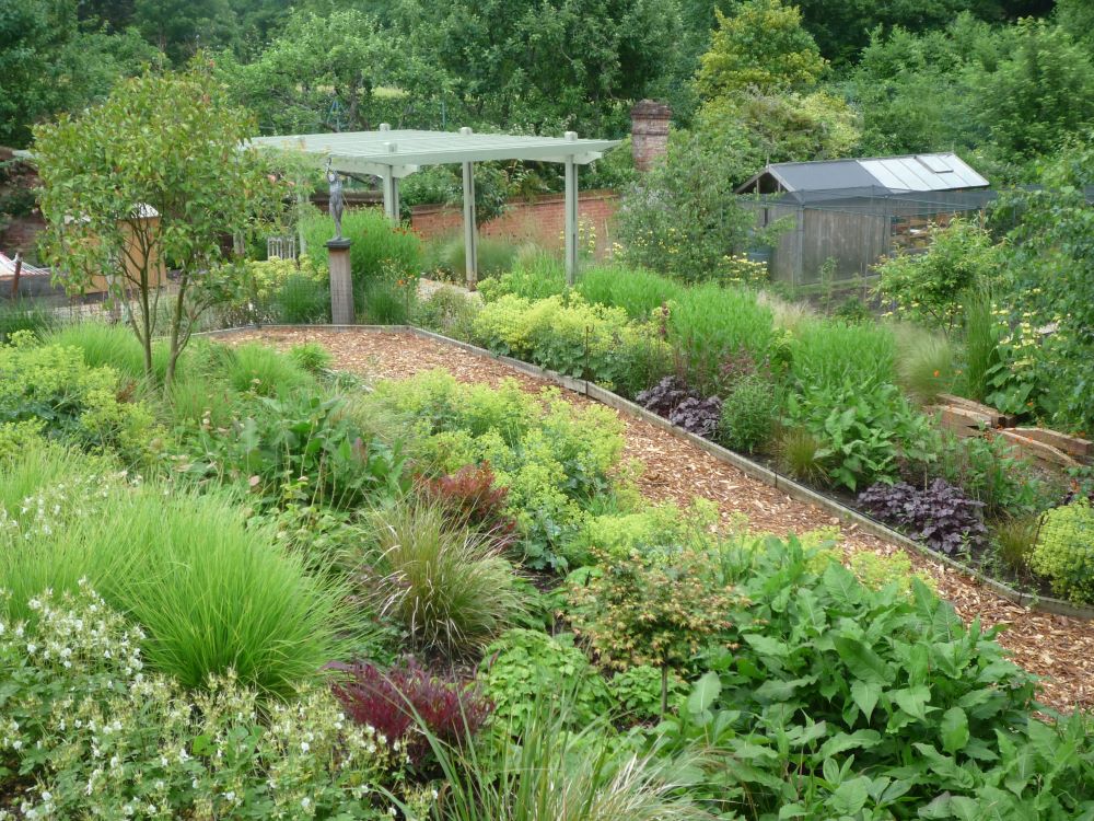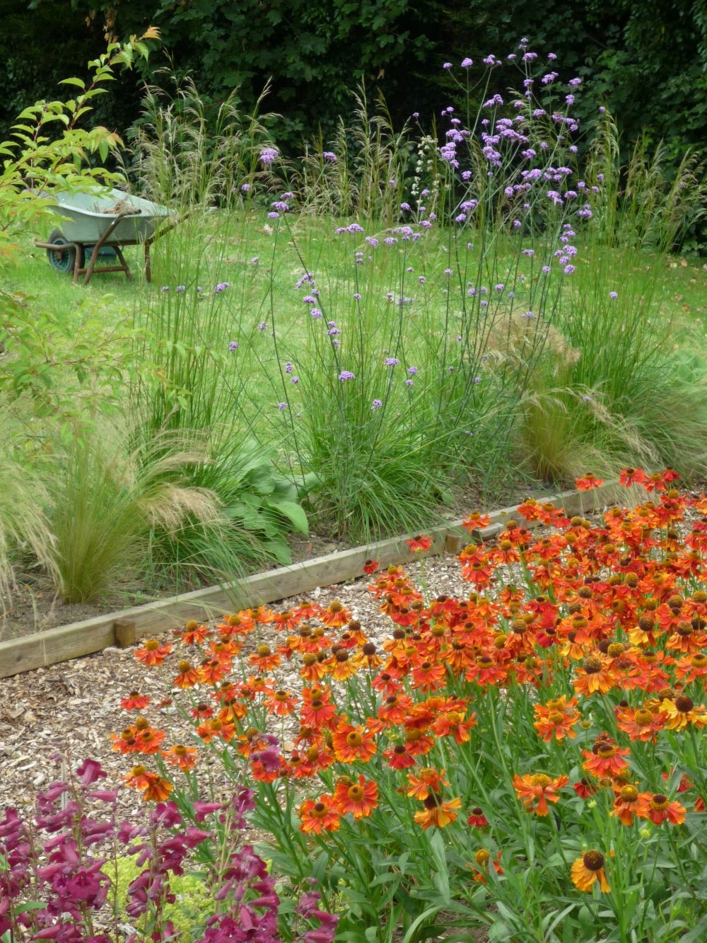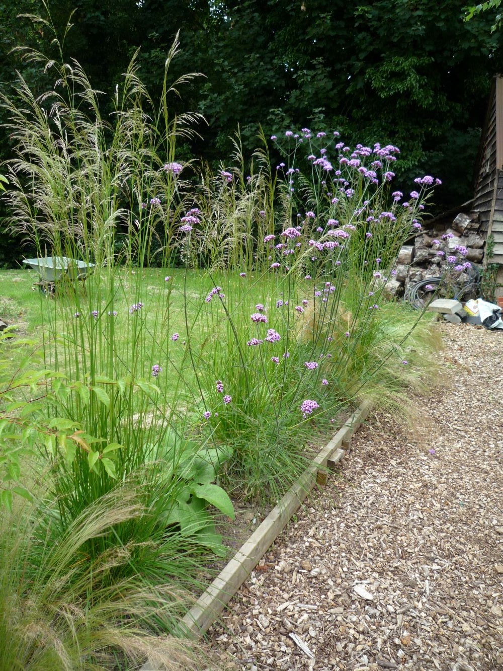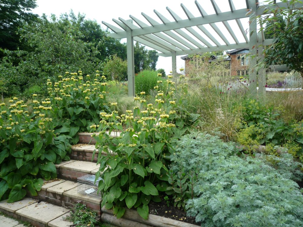 Grasses throughout the borders complement the perennials and at the lower end of the garden, together with Verbena and Phlomis, provide a delicate screen to the garden beyond.