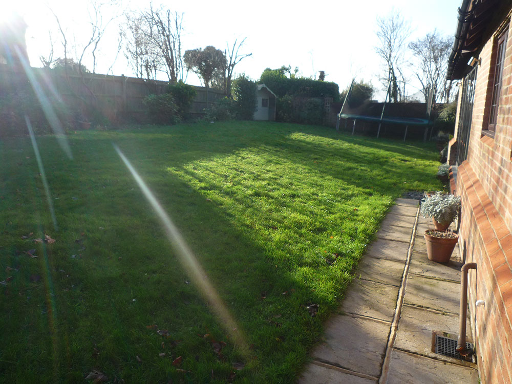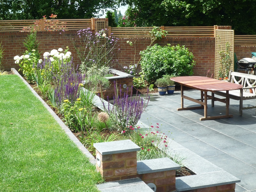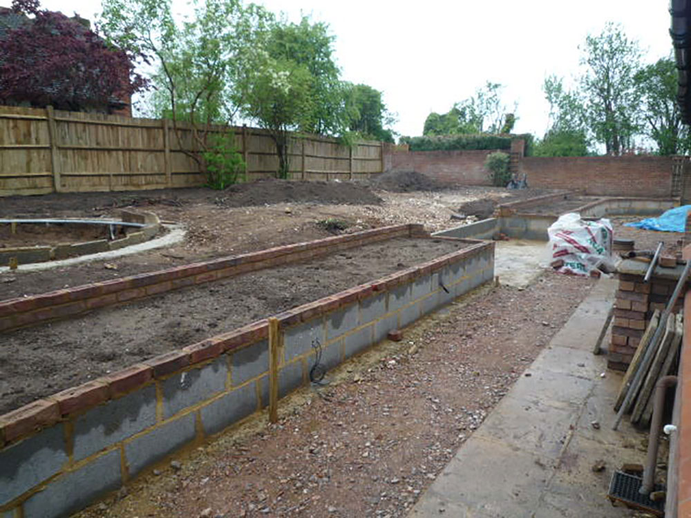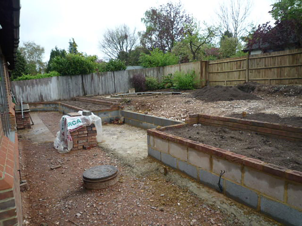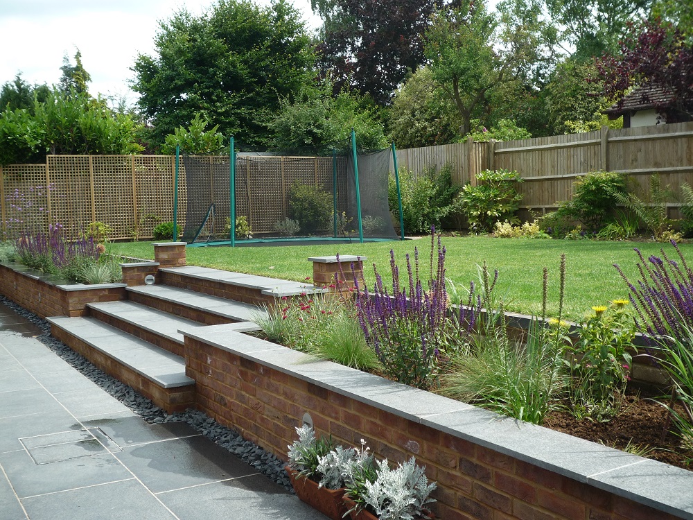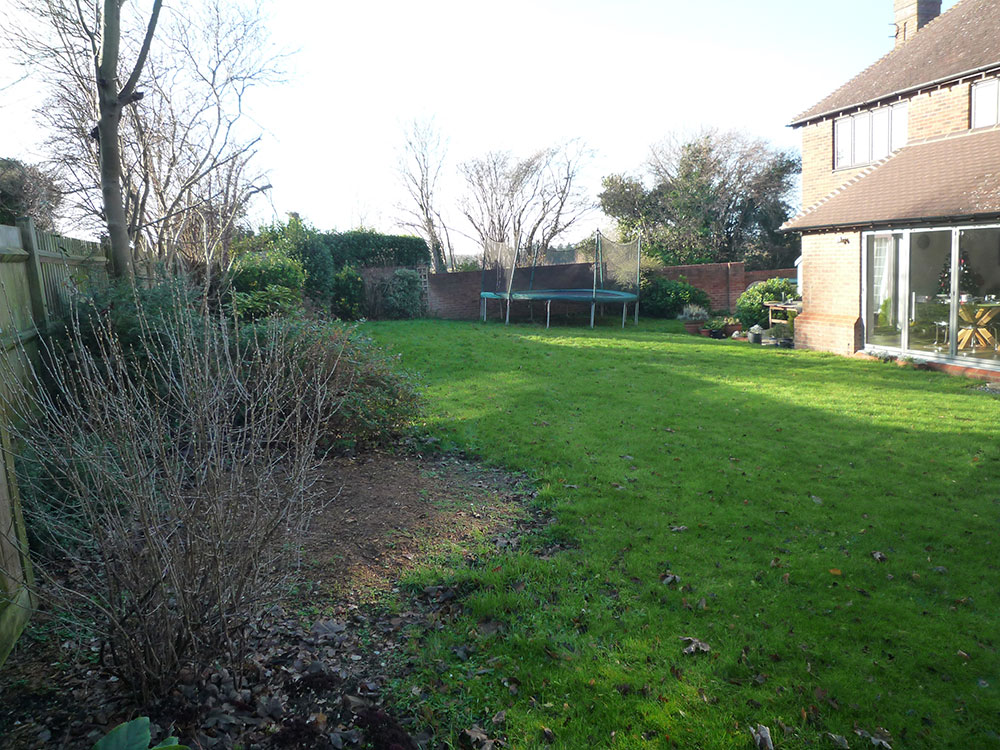 Steps now lead from the wide bi-fold doors onto a rectangular lawn and retaining beds were faced with bricks to match the house. The trampoline is sunken and placed to one side of the garden out of immediate view from the dining area.