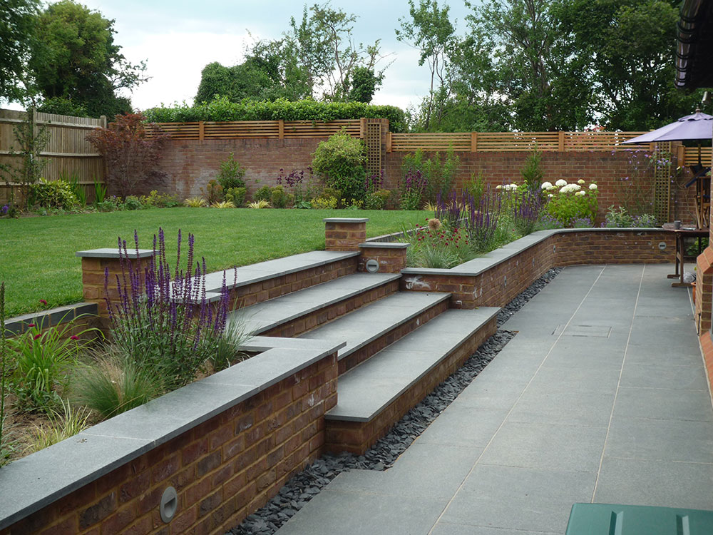 Black basalt paving was the choice for the patio and steps; a hard wearing volcanic stone with a smart contemporary look. The grey colour also tied in with the windows of the house.