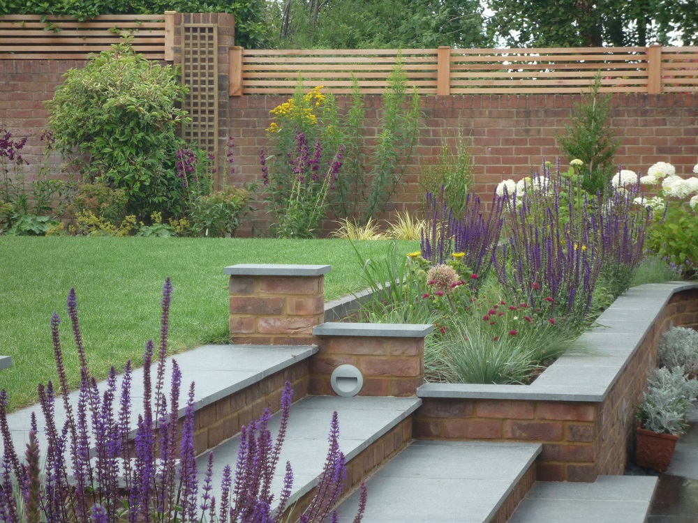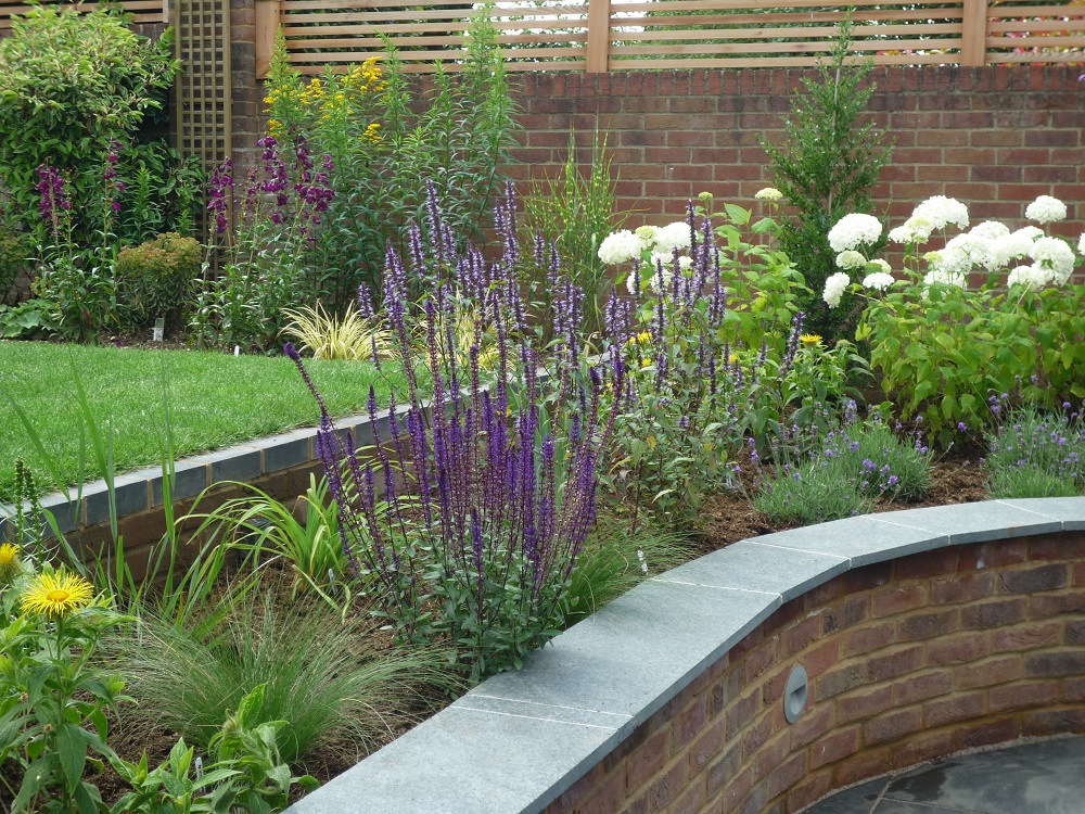 Contemporary cottage style planting softens the look; grasses mixed in with perennials salvia, knautia, alliums, lavender, verbena and heleniums. Evergreen shrubs Phlomis, Griselinia and Ceanothus provide structure. An existing mature Lilac was retained for screening, along with Cornus and an orange climbing rose complimented the rest of the planting beautifully.