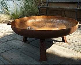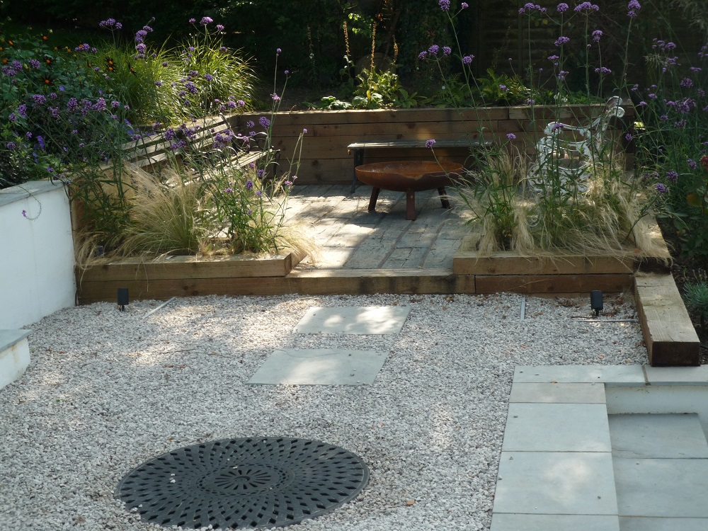 On the other side of the garden a chill-out zone features a corten steel firepit and Stonemarket 'timberstone' decking, which is a concrete product resembling old sleepers, but non-slippery and so much safer.