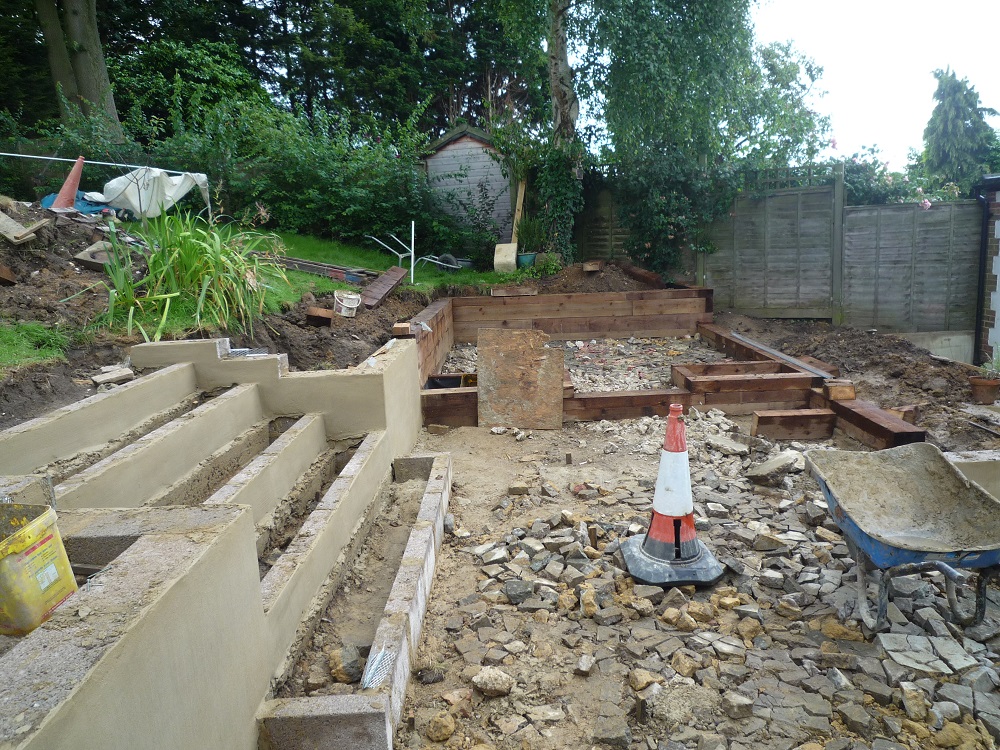 The brief was for a new contemporary patio and steps, and outdoor kitchen with a pizza oven and barbecue, a child-friendly water feature and a relaxed chill out zone with fire-pit and seating.