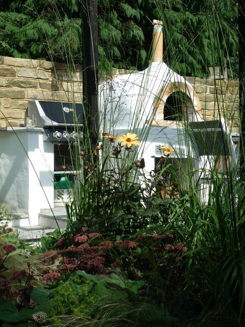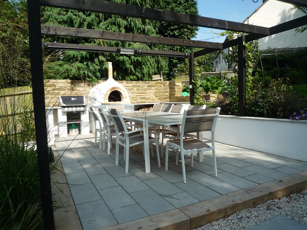 The outdoor kitchen includes a pizza oven built by my client. The barbecue was integrated into the design with sandstone bench tops for food preparation and serving. The wall behind the oven is made from the large chunks of Yorkstone that were found amongst the original walls in the garden providing a unique and contrastingly rustic backdrop to the garden.