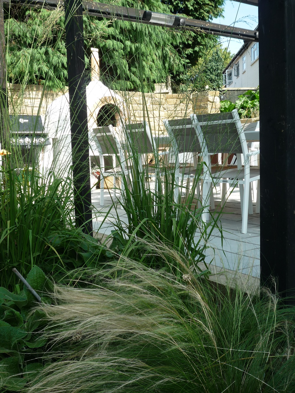 The dining area has a simple black stained arbour for growing a grape vine, the large leaves of the vine will provide shade once fully trained on the arbour.