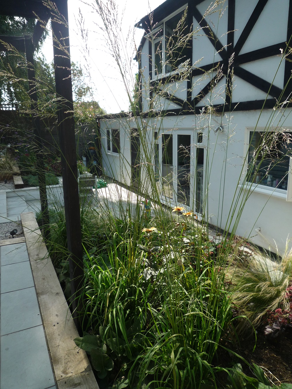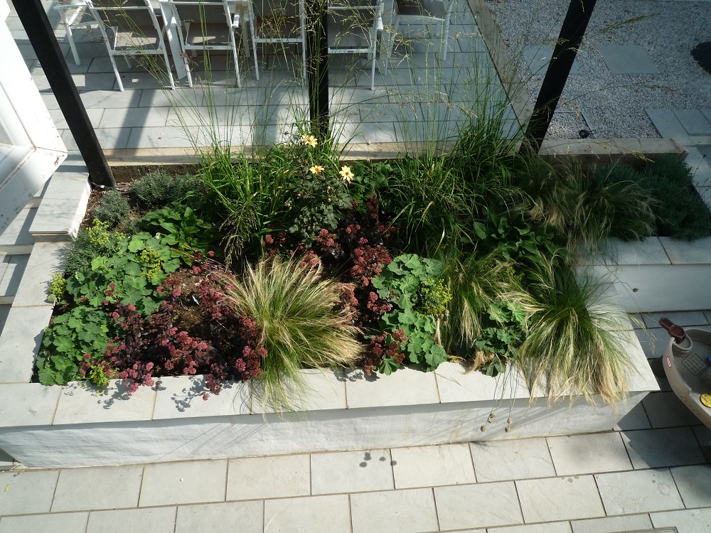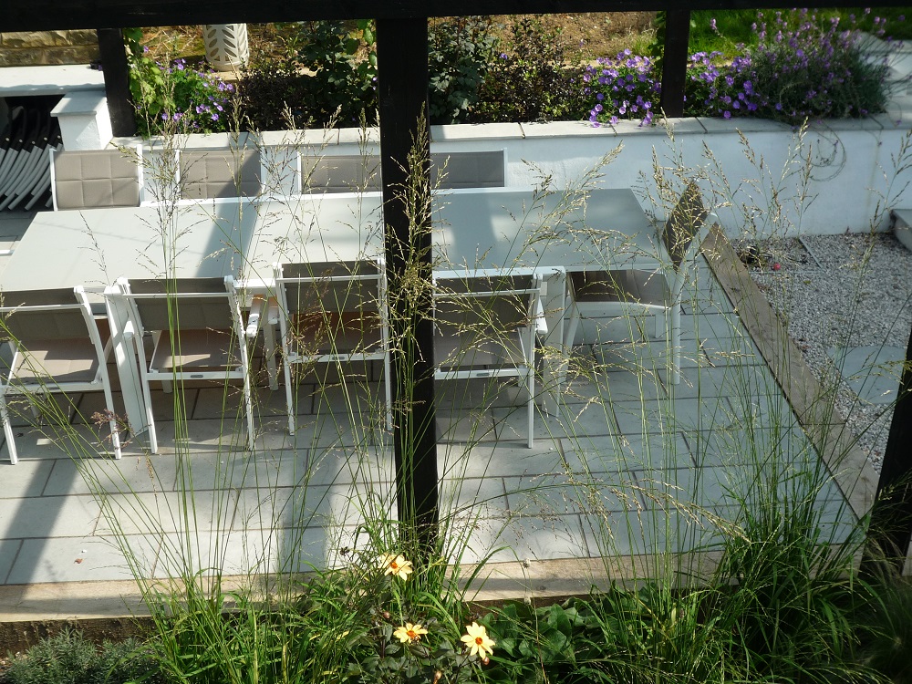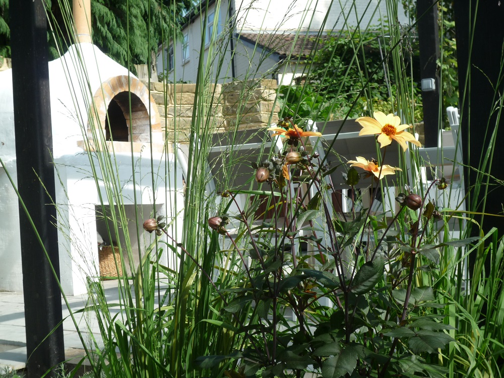 The relaxed planting of grasses and perennials has grown really well after only one season. Molinia, stipa, phlomis, sedums and alchemilla form the basis, with highlights of verbena, dahlias, alliums and rudbeckia.
