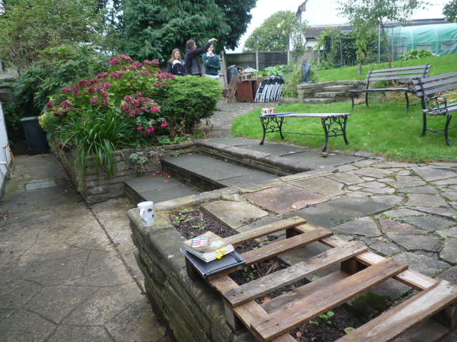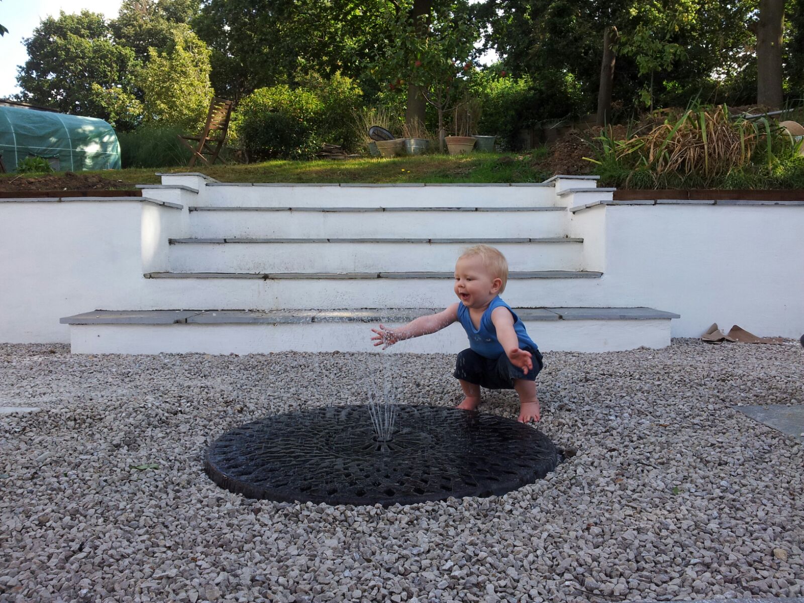 Steps lead onto a central gravelled area with a child-friendly water feature made from an old table top; the water fountain comes from the centre.
