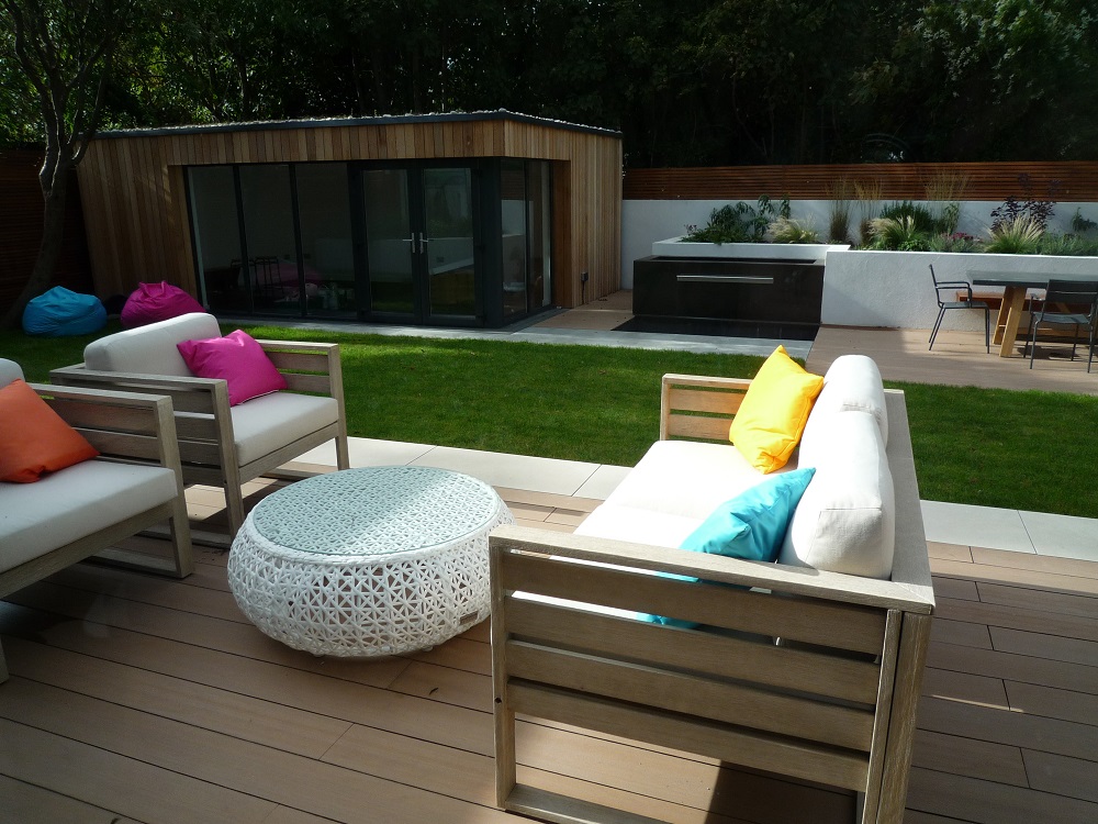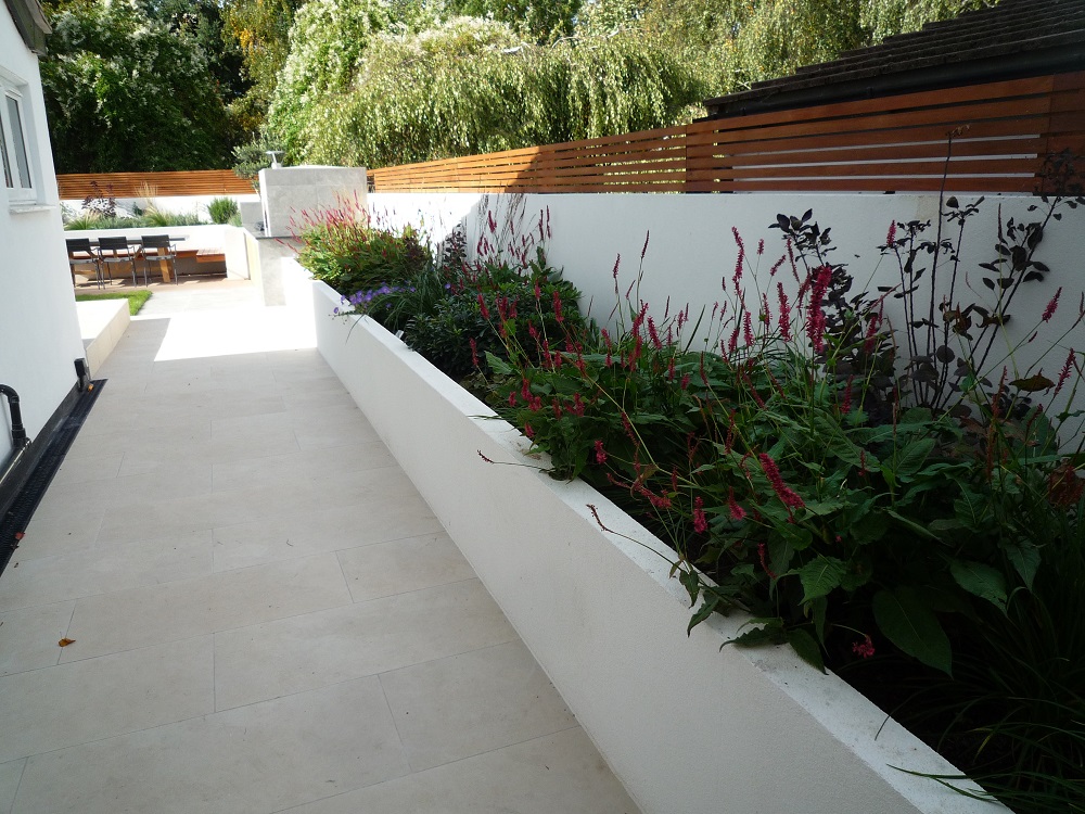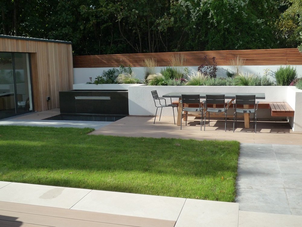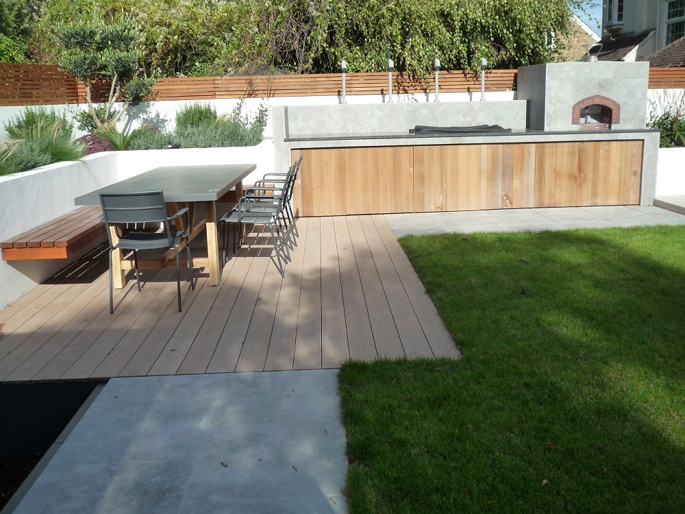 The brief was to create a contemporary style garden to complement the house and the garden building, to incorporate a pizza oven and barbecue, dining area, white rendered raised beds, as much lawn as possible, and a water feature for the rescue goldfish.