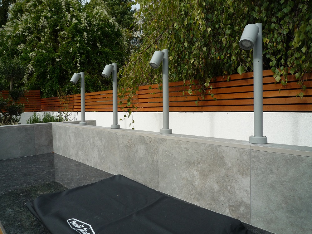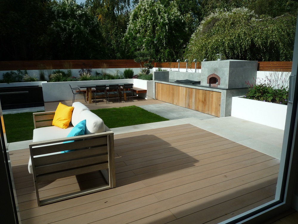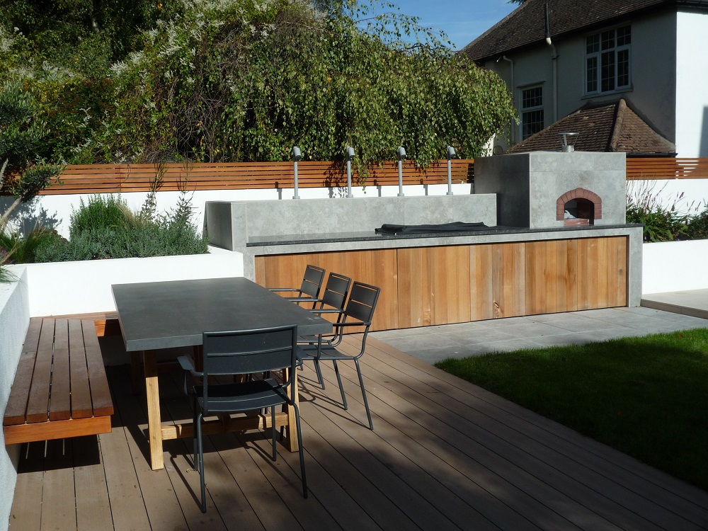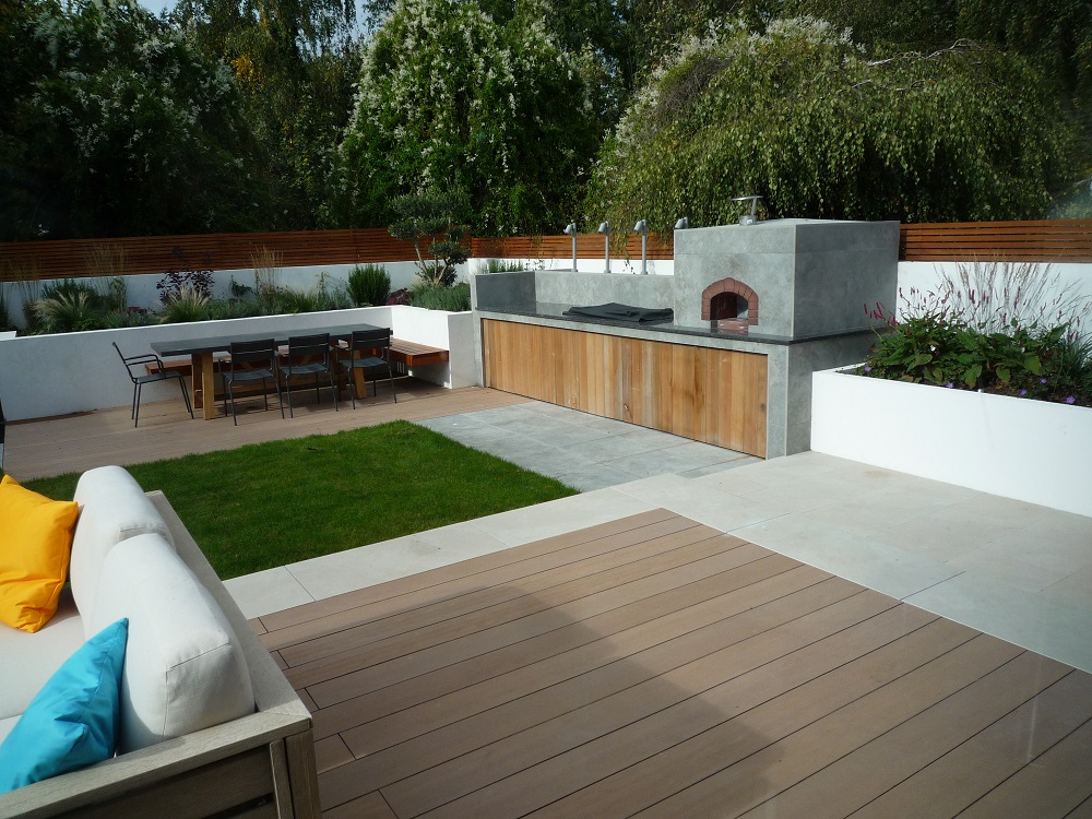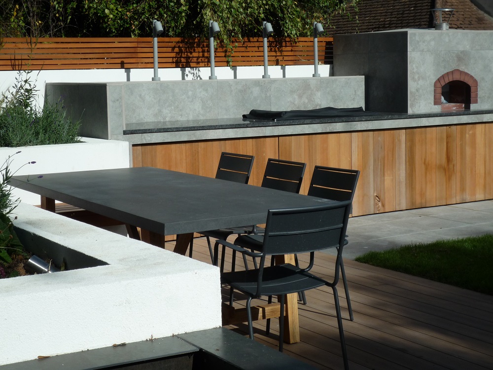 The sleek outdoor kitchen houses a porcelain clad pizza oven, barbecue and granite work surfaces. The paving is a mix of the same London Stone porcelain, in grey 'Silver Contro' and cream 'Slab khaki', plus London Stone composite decking, 'Designboard' in 'mocha' colour. The water feature with a wide waterfall blade is clad with thin porcelain called 'Designclad', again from London Stone.