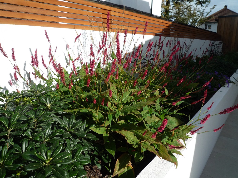 The new planting includes a cloud pruned Olive, situated in the hottest part of the garden, with grasses, lavender, sedums and cornflowers giving a light airy feel. In the more shady parts, hakonechloa grasses and persicaria provide a long season of interest.