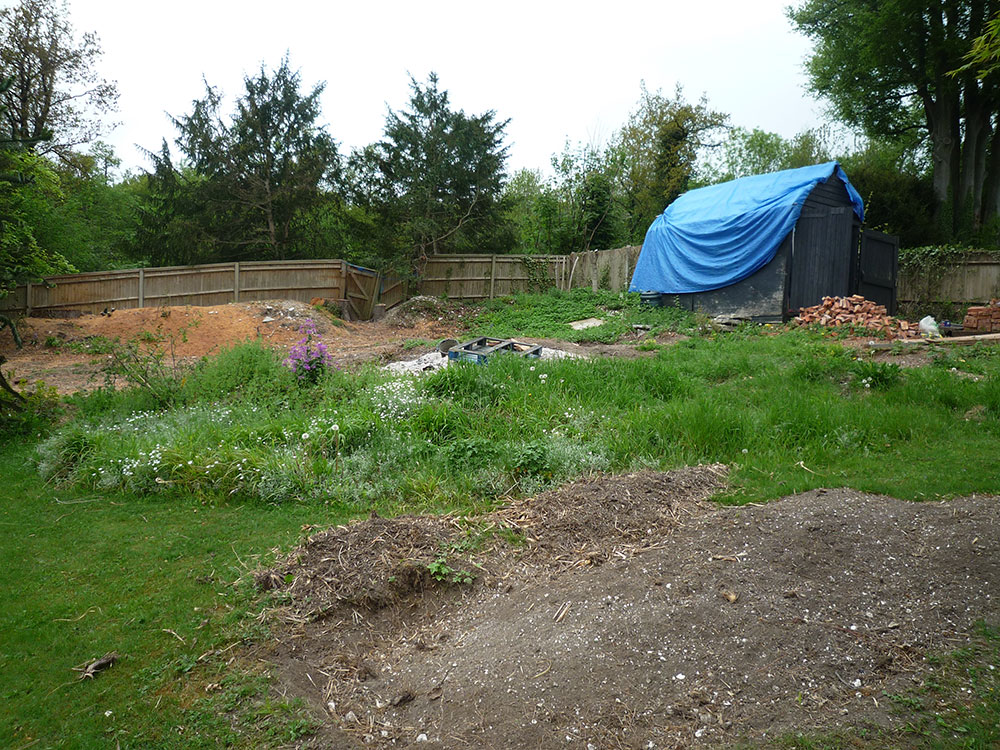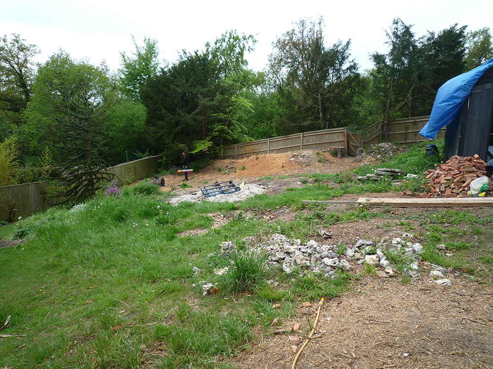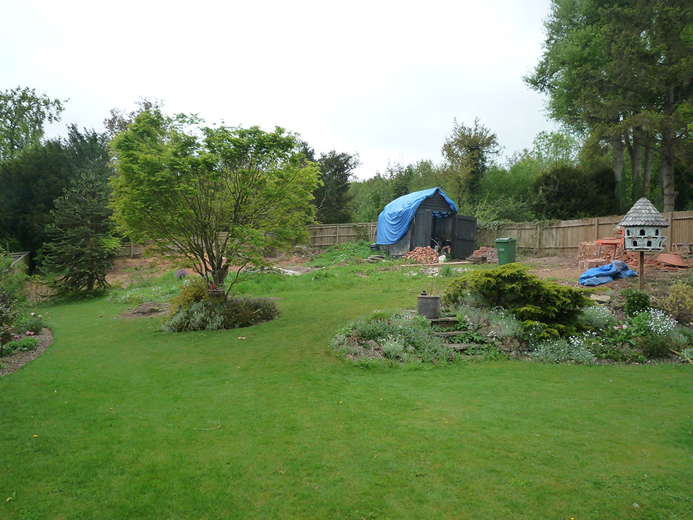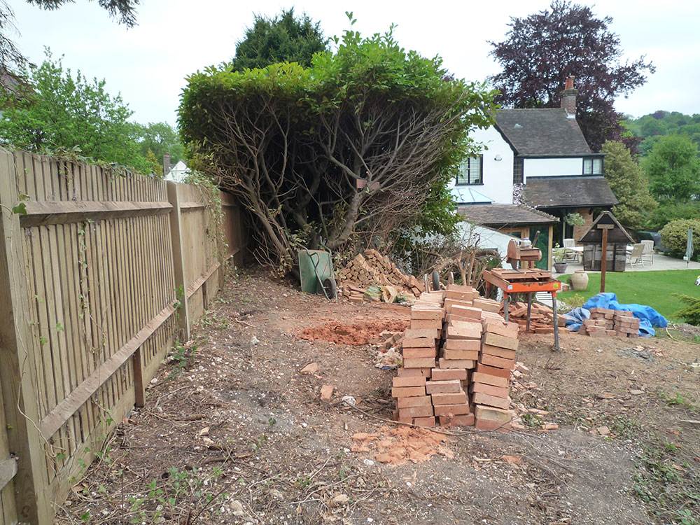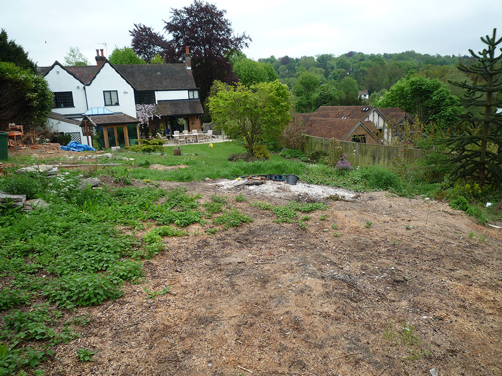 A large steeply sloping garden that had previously been overgrown and hidden by large shrubs. The area was cleared and there was to be an oak framed garden building and a sunken hot tub.