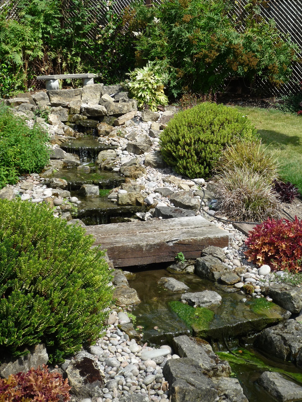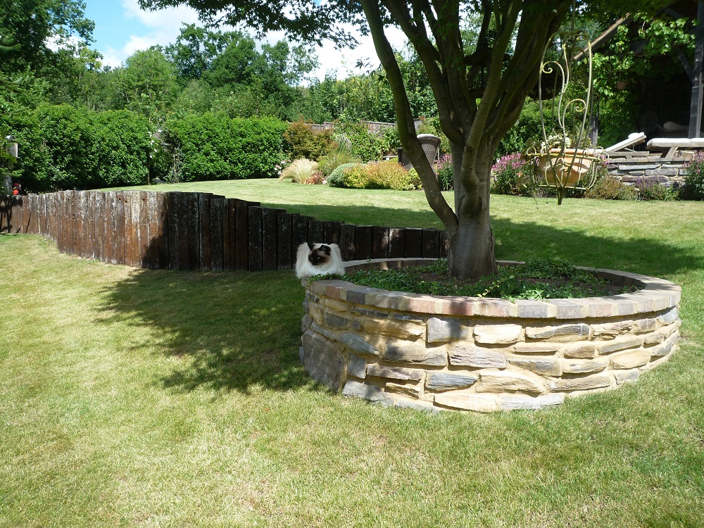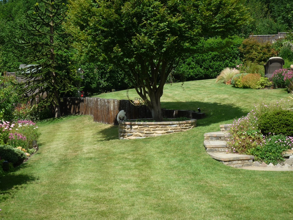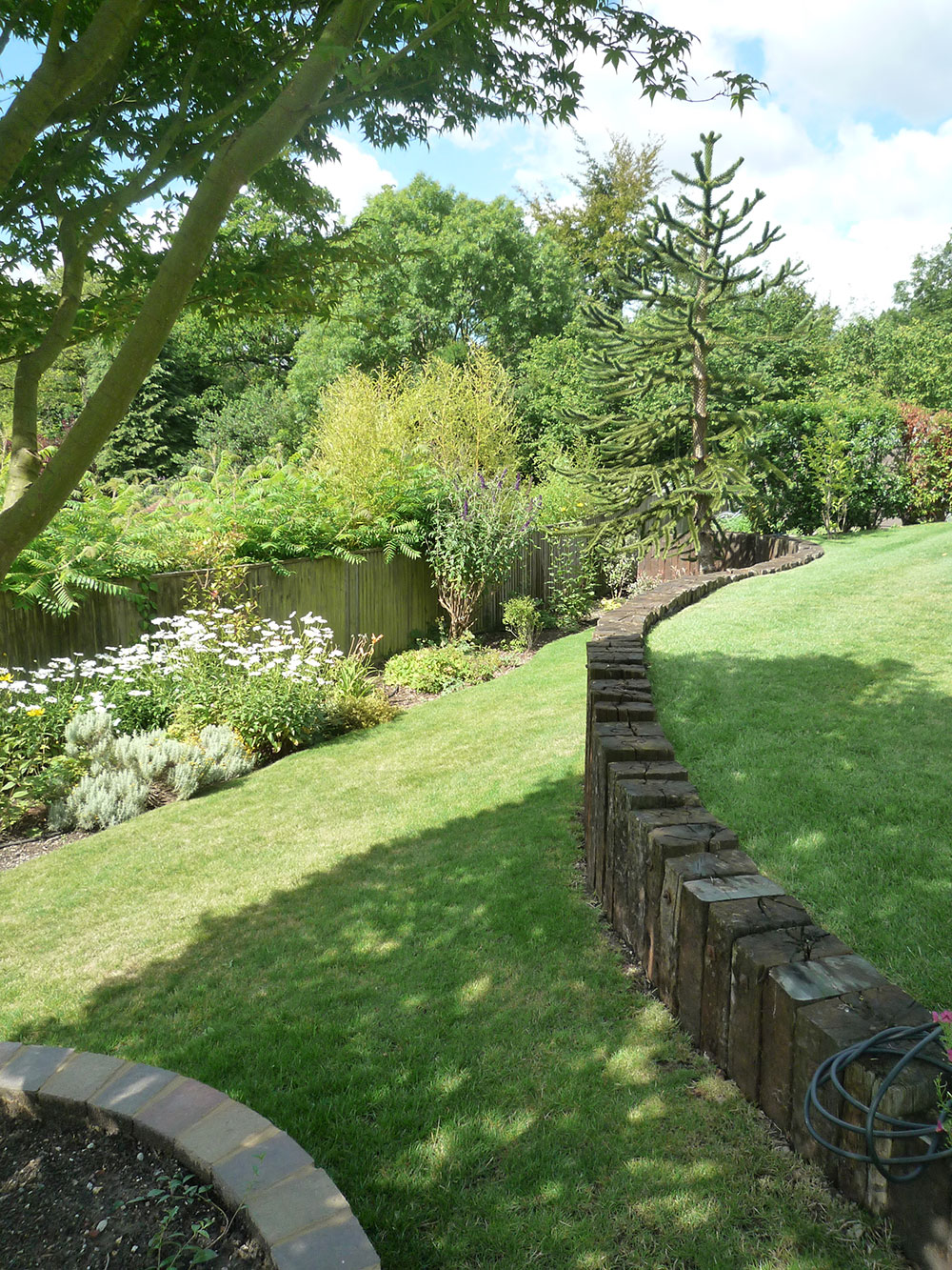 Old railway sleepers on edge curve round to retain the main bank, creating more suitable lawn areas.