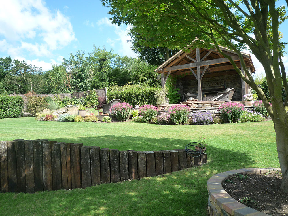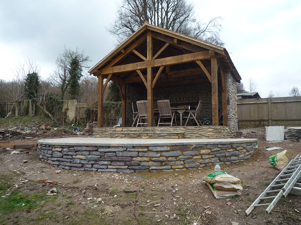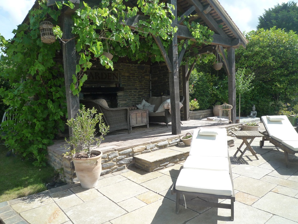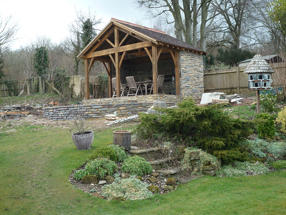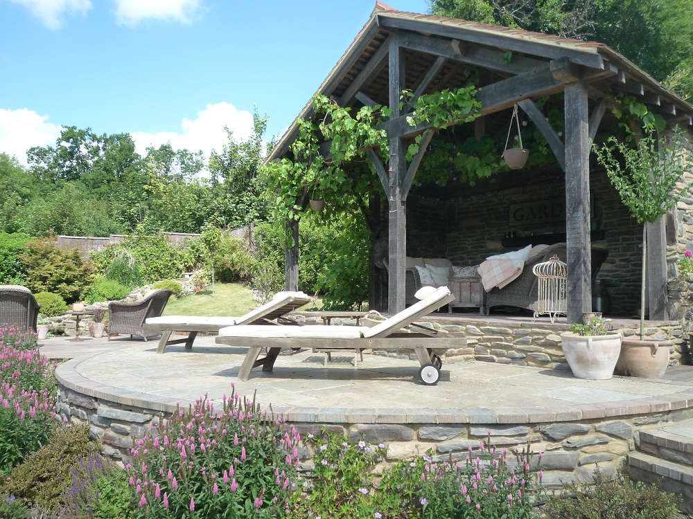 The oak gazebo is clad with an attractive man made material from Fossil Stone www.fossil-stone.co.uk that imitates a dry stone wall. The flooring is Timberstone, a concrete product from Stonemarket www.stonemarket.co.uk resembling old sleepers, but which is more practical and gives a suitably rustic look.