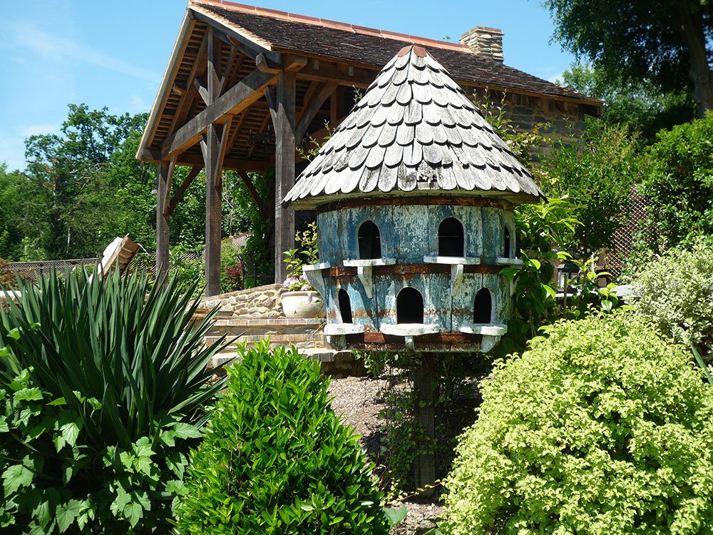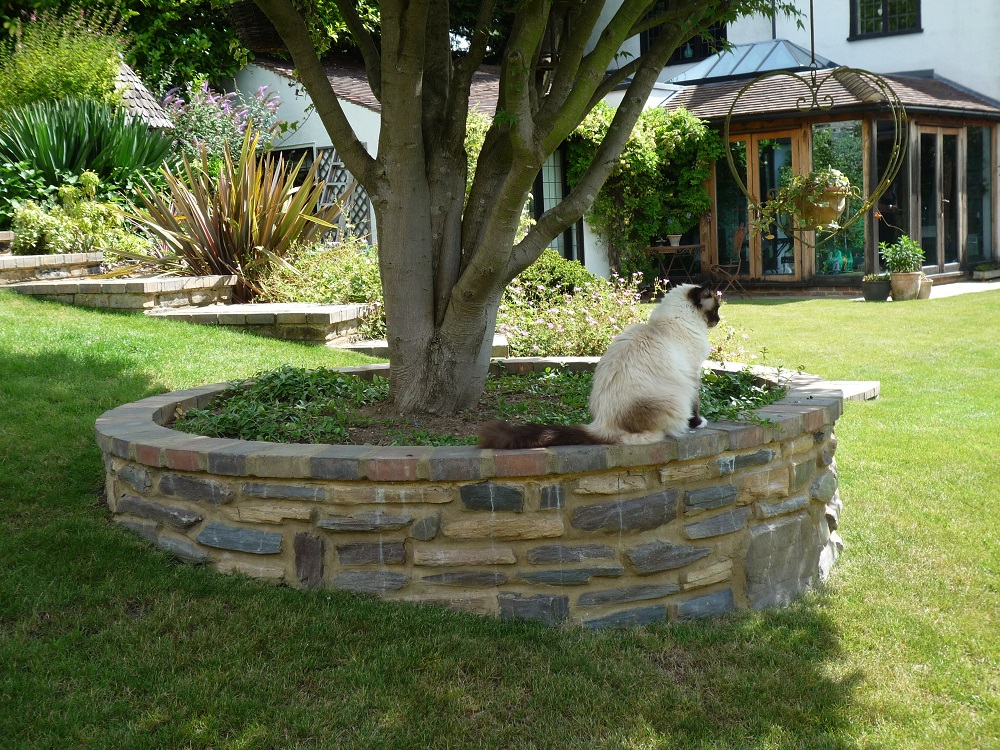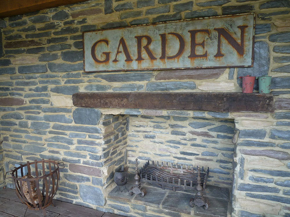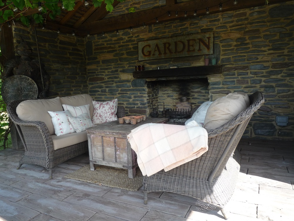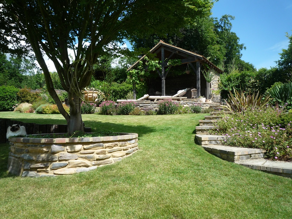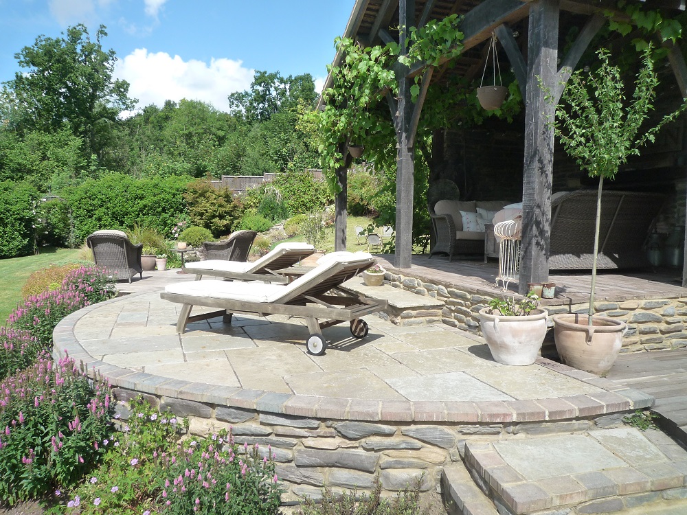 The oak gazebo is clad with an attractive man made material from Fossil Stone www.fossil-stone.co.uk that imitates a dry stone wall. The flooring is Timberstone, a concrete product from Stonemarket www.stonemarket.co.uk resembling old sleepers, but which is more practical and gives a suitably rustic look.