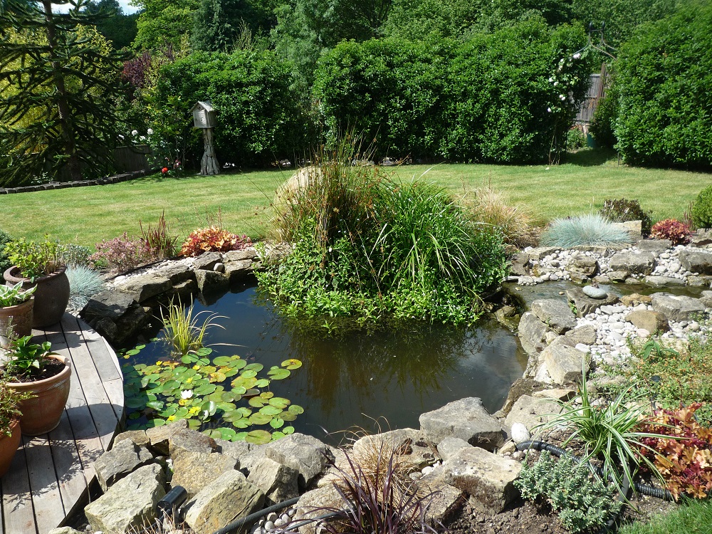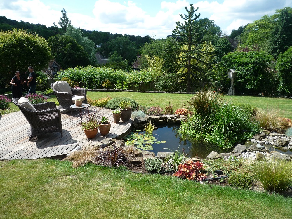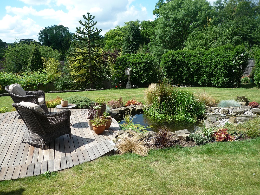 Working with the natural slope of the garden as much as possible, the design lent itself to a natural stream tumbling down to a small pond, viewed from a decking platform. This links up with the terrace leading out from the garden building for sun lounging and a sunken hot-tub tucked is in a discreet corner.