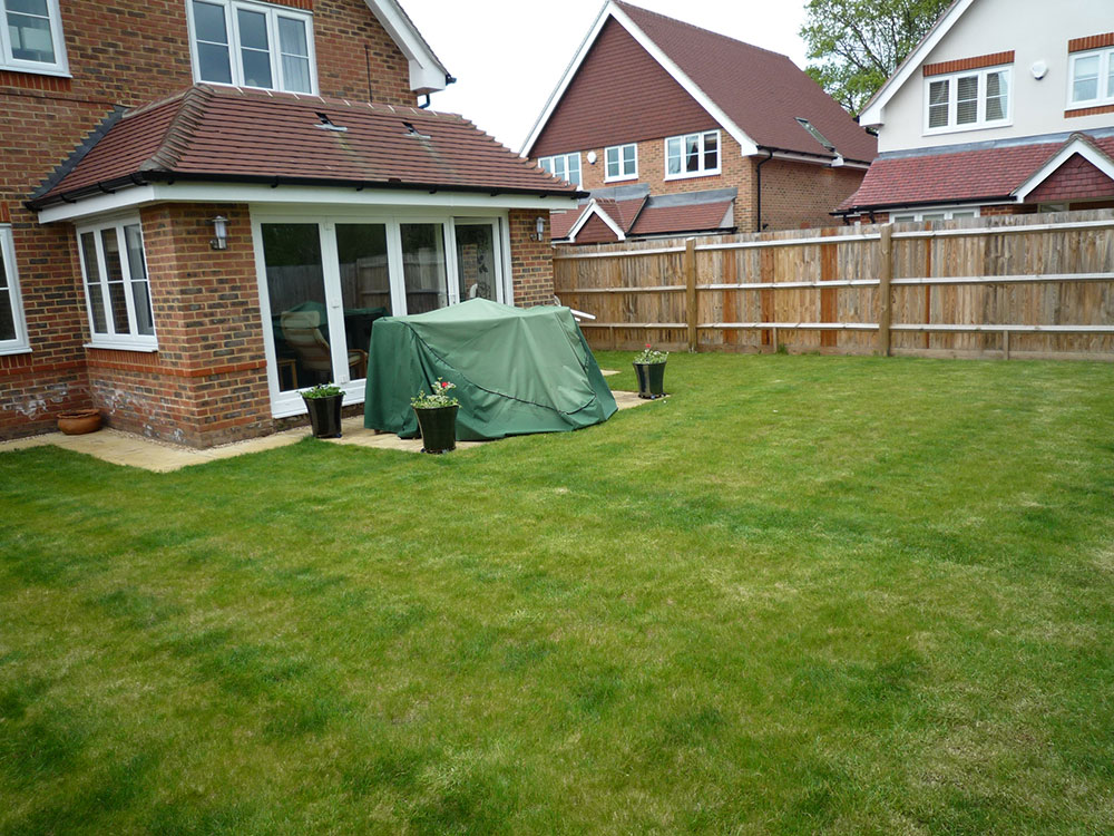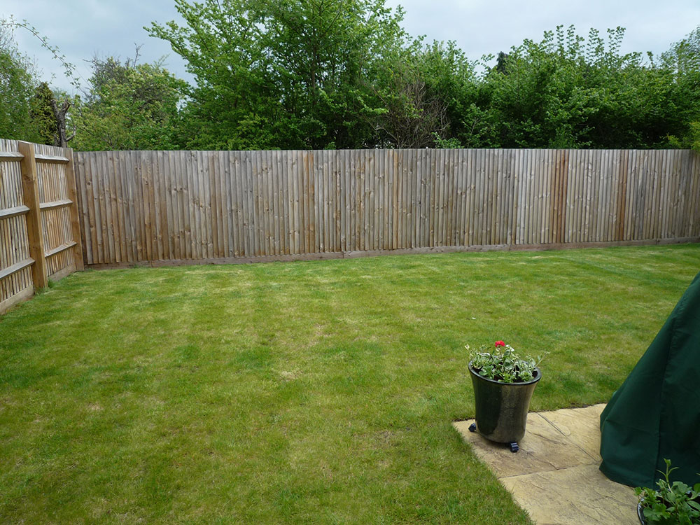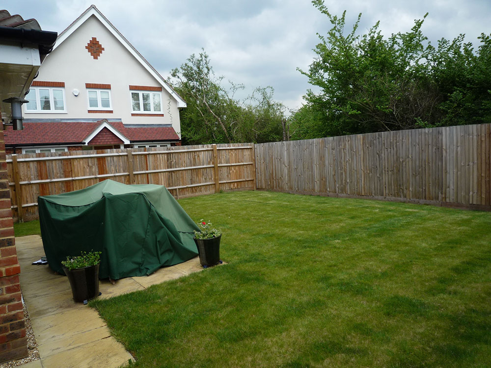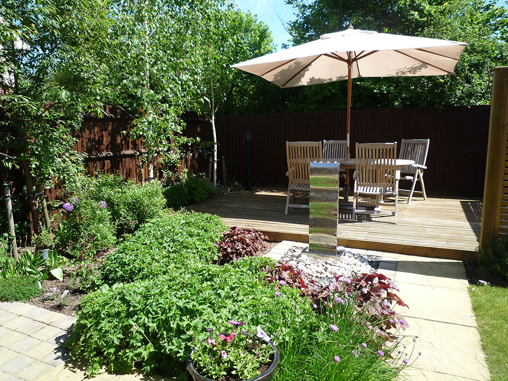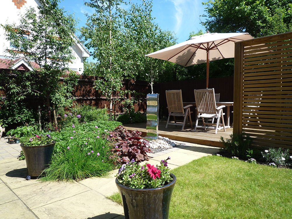 The brief for this new build garden was to provide a generous sized decking area for dining and relaxing, overlooking a contemporary water feature. Also trees were required to screen the houses nearby.