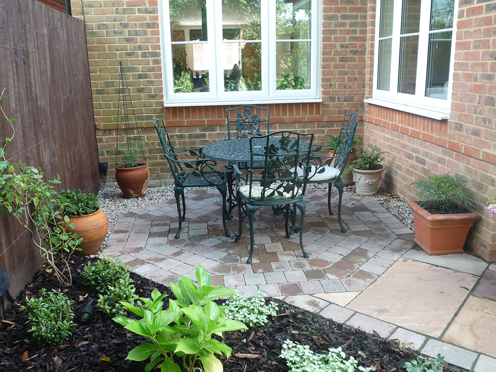 A damp corner to the side of the house was made more interesting by laying setts in a hexagonal shape. At the height of the summer it gives a welcome spot to sit in the shade while viewing the garden.