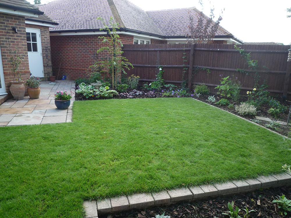A design on the diagonal was chosen, and this had the effect of making the garden look wider. Setts edge the lawn to define and keep the shape.