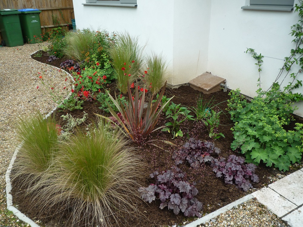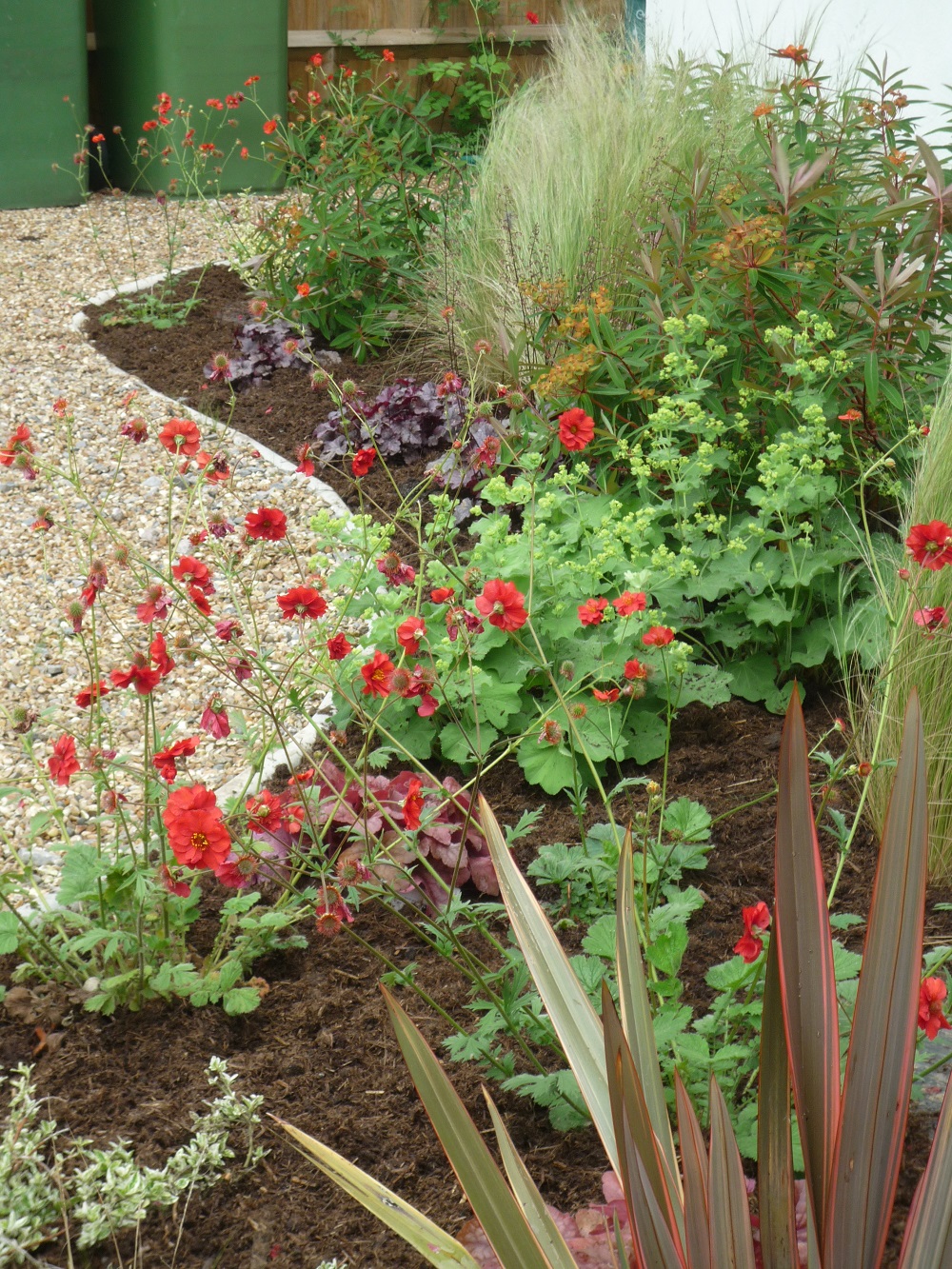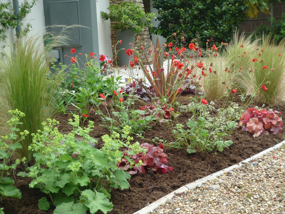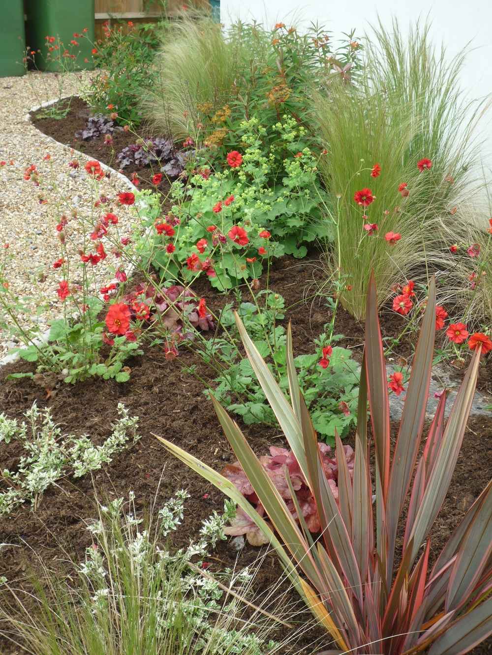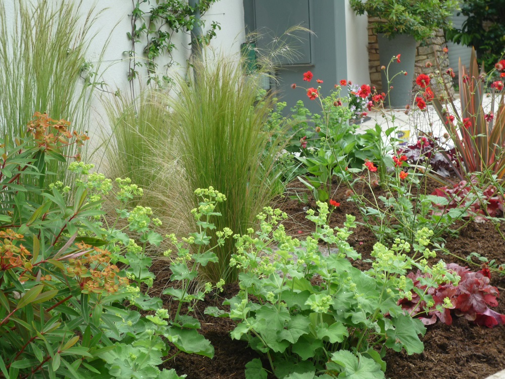 The soil was quite heavy clay and so the plants chosen to suit; Alchemilla mollis, long flowering Potentilla 'Mrs Bradshaw' and Euphorbia griffithii 'Fireglow' provide the colour against a backdrop of purple Heucheras and a Phormium for structure. Stipa tenuissima grasses give a contemporary touch.