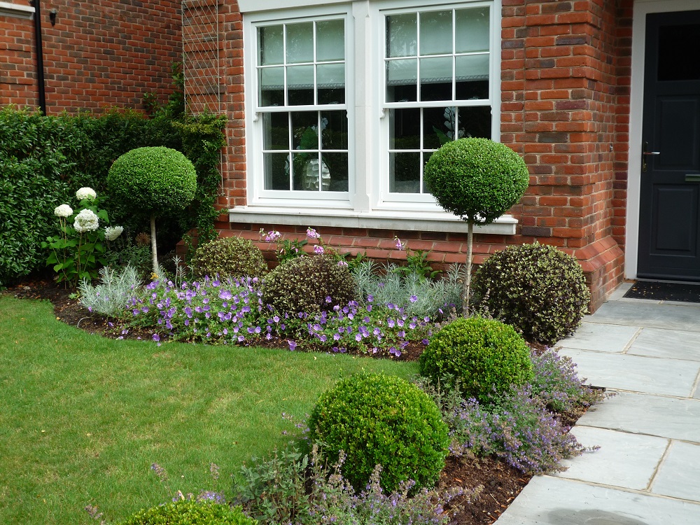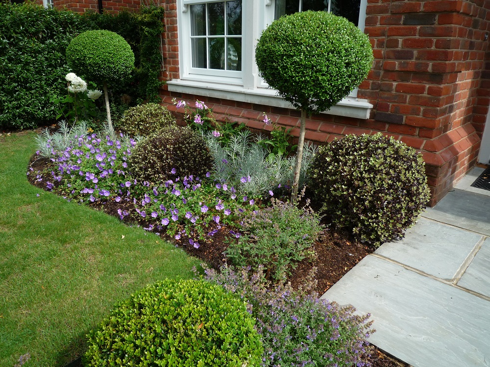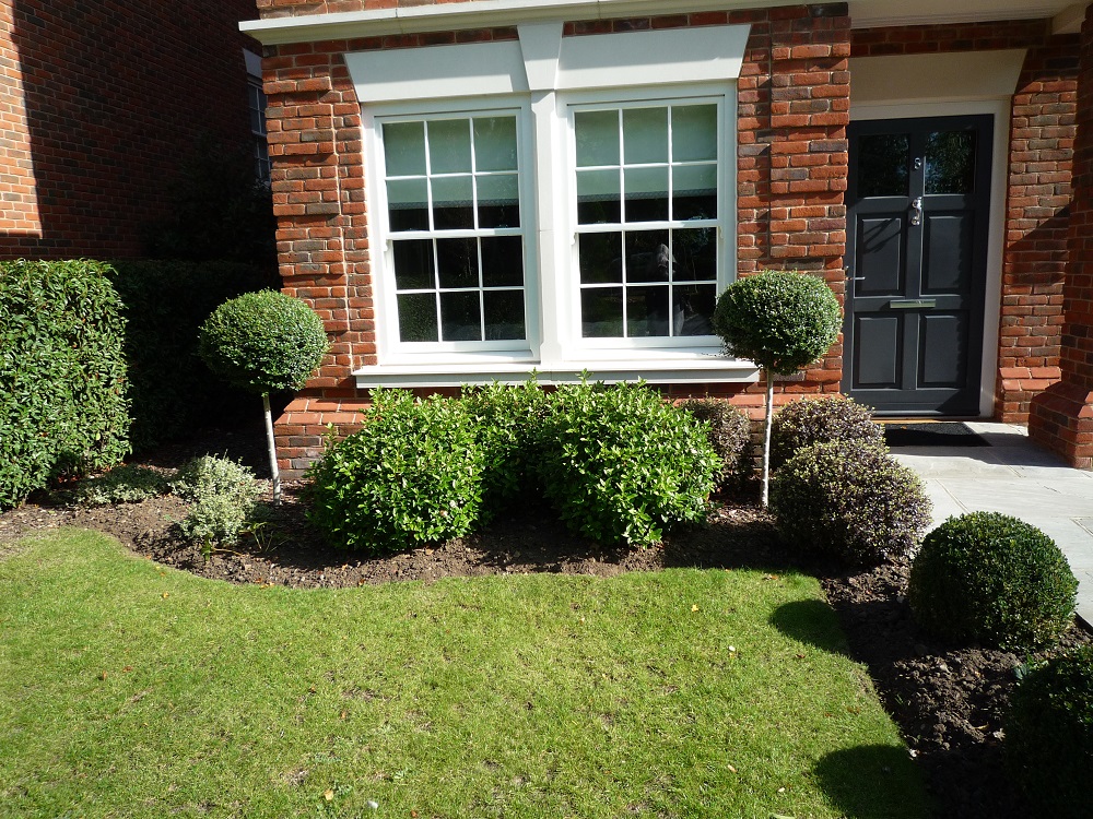 The original planting included 3 big Viburnum tinus shrubs under the window which were removed and used in the back garden where they serve as a good evergreen backdrop in a larger border. The existing Ligustrum half standards and the box balls were kept in position while the Pittosporum 'Tom Thumb' balls were re-positioned.