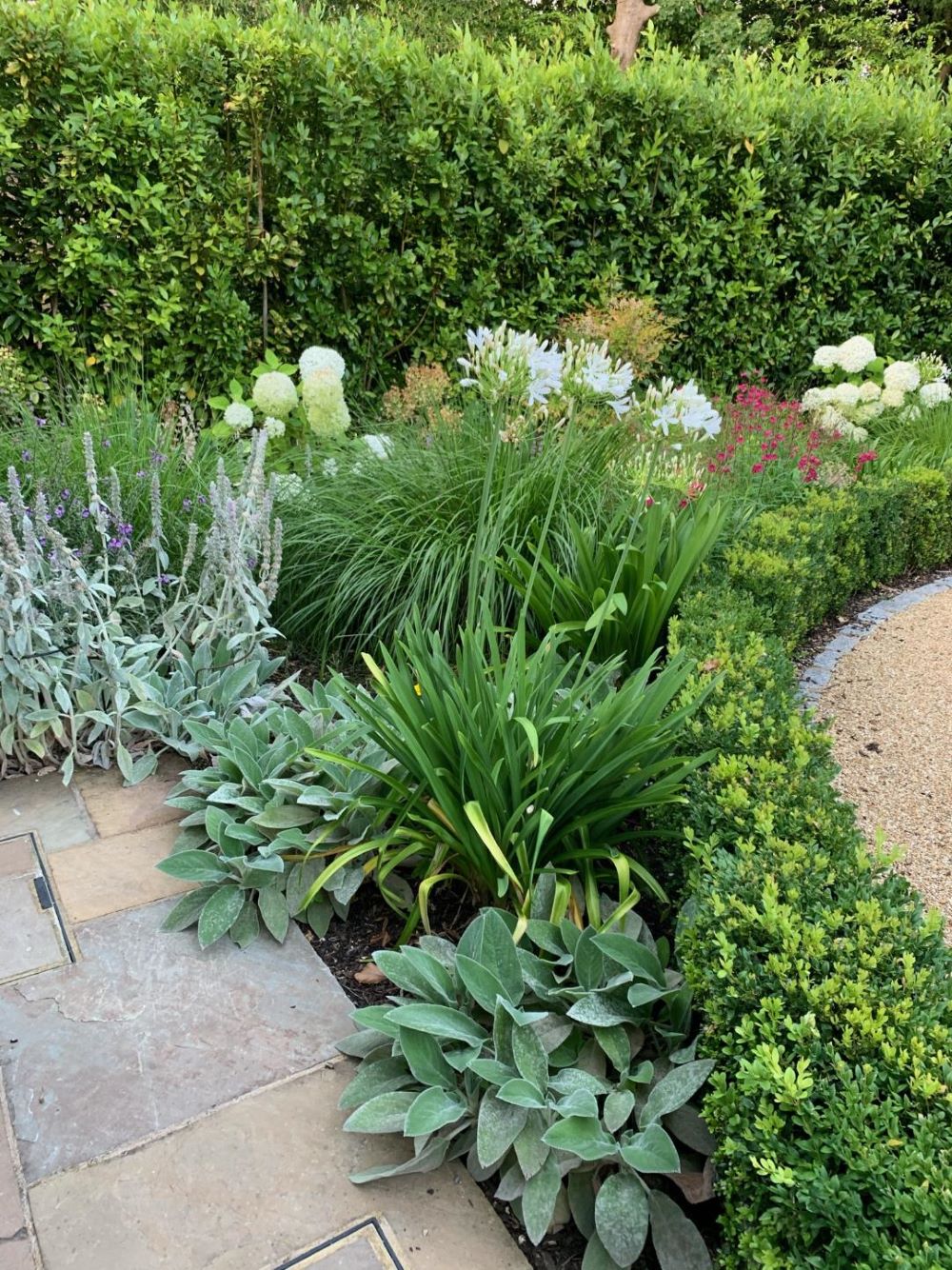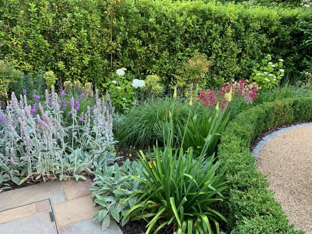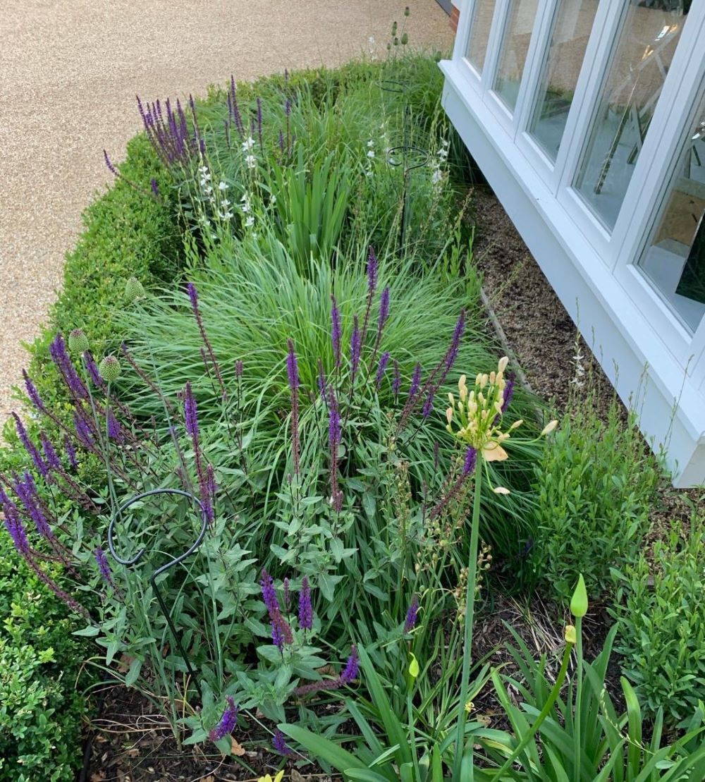 The best of the planting was retained but now includes more perennials such as sun loving Salvias, Camassias, Gaura and silvery Stachys lanata to pop up amongst the structural evergreens.