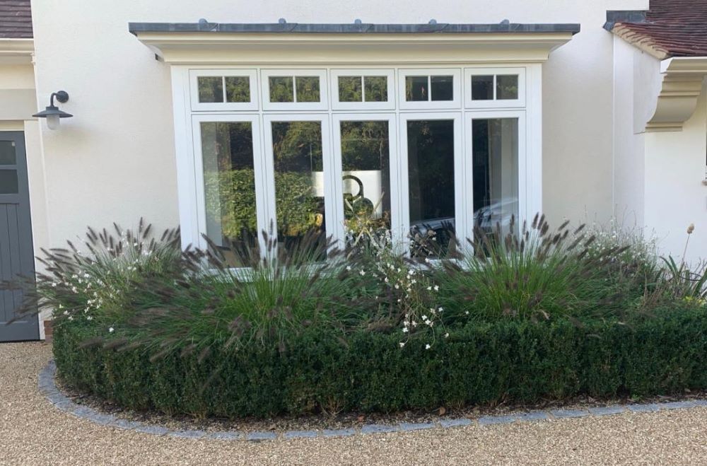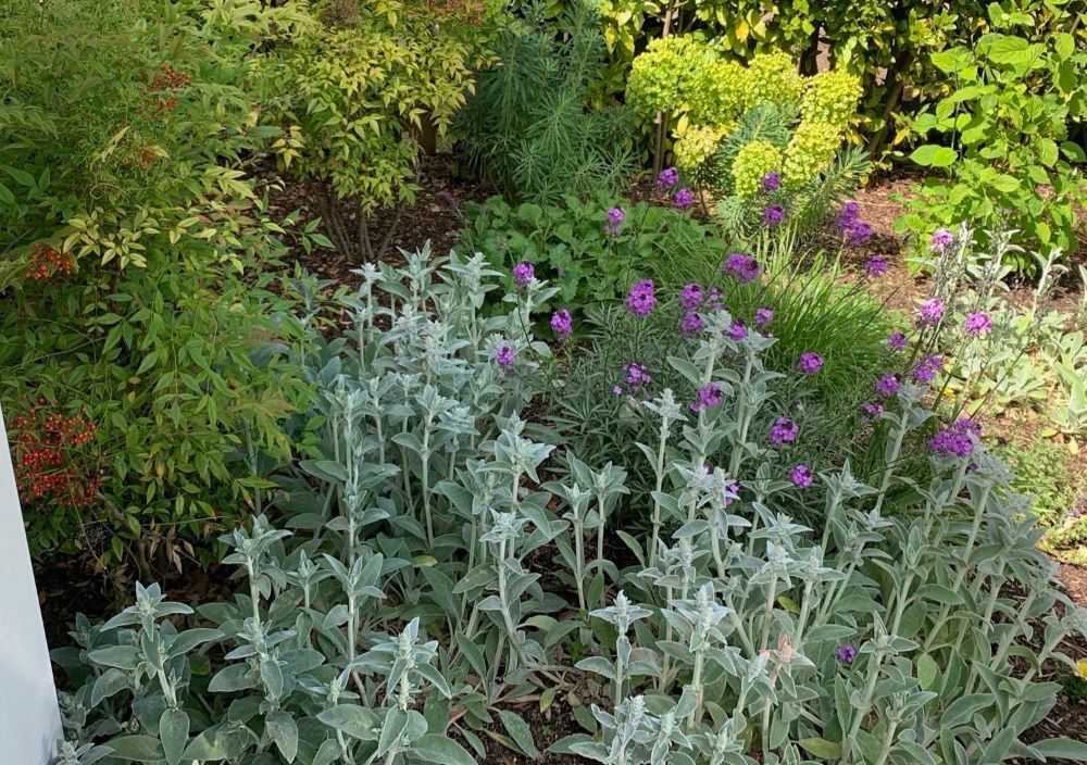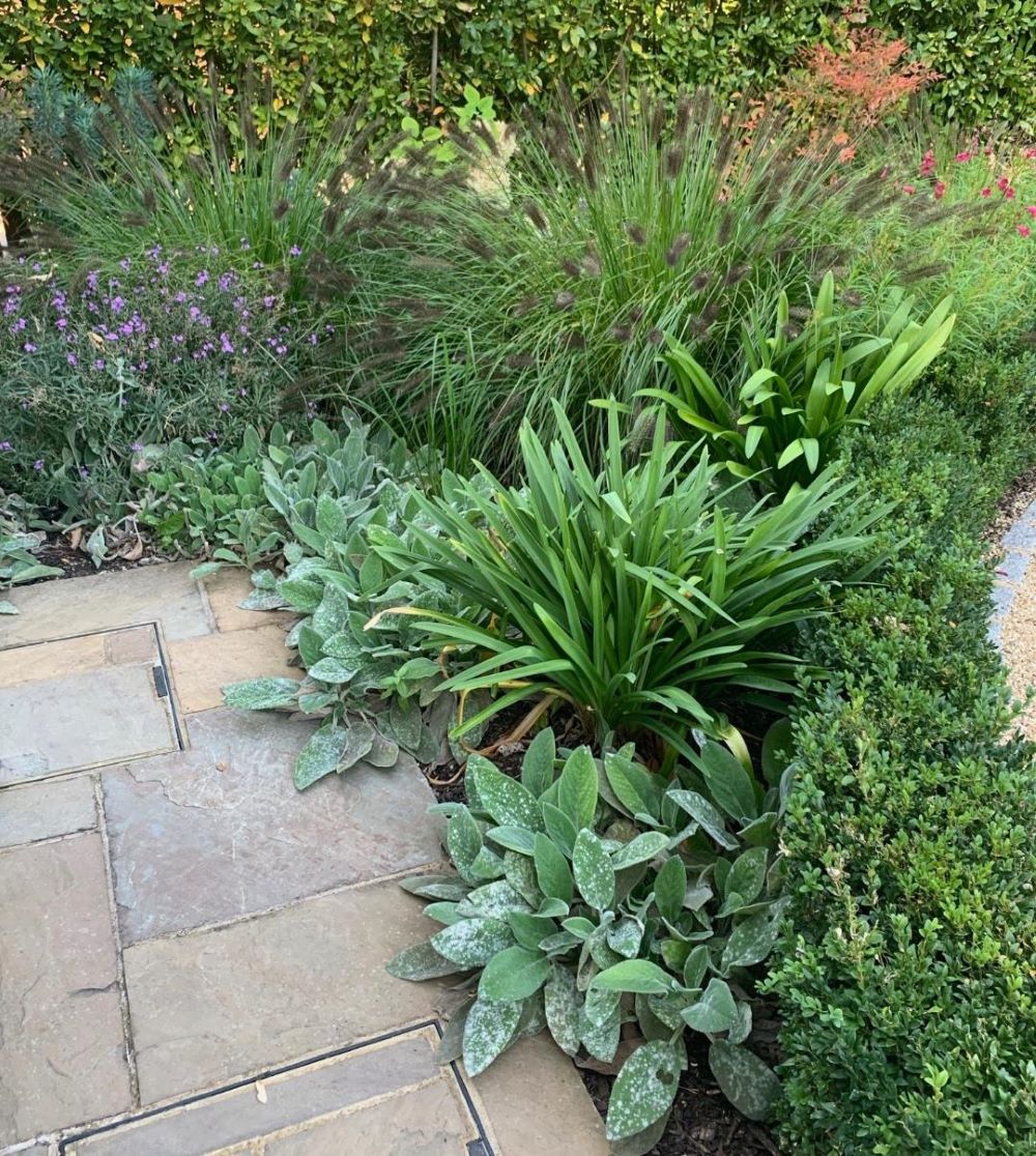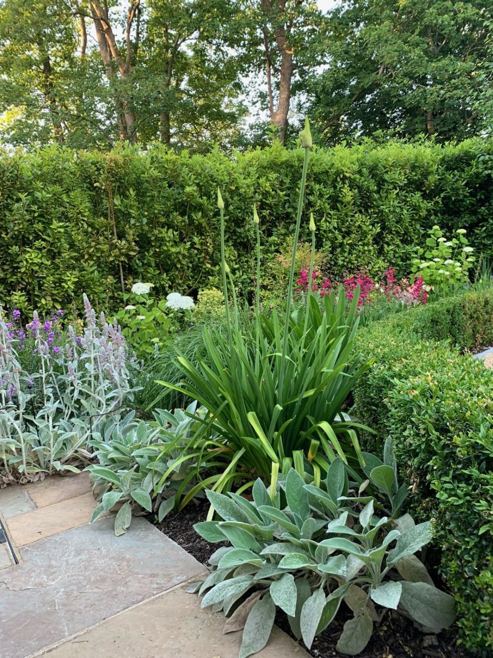 The best of the planting was retained but now includes more perennials such as sun loving Salvias, Camassias, Gaura and silvery Stachys lanata to pop up amongst the structural evergreens.
