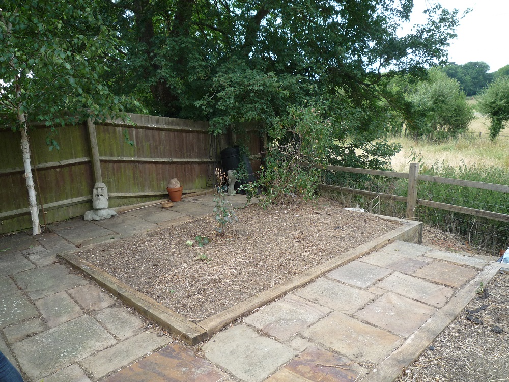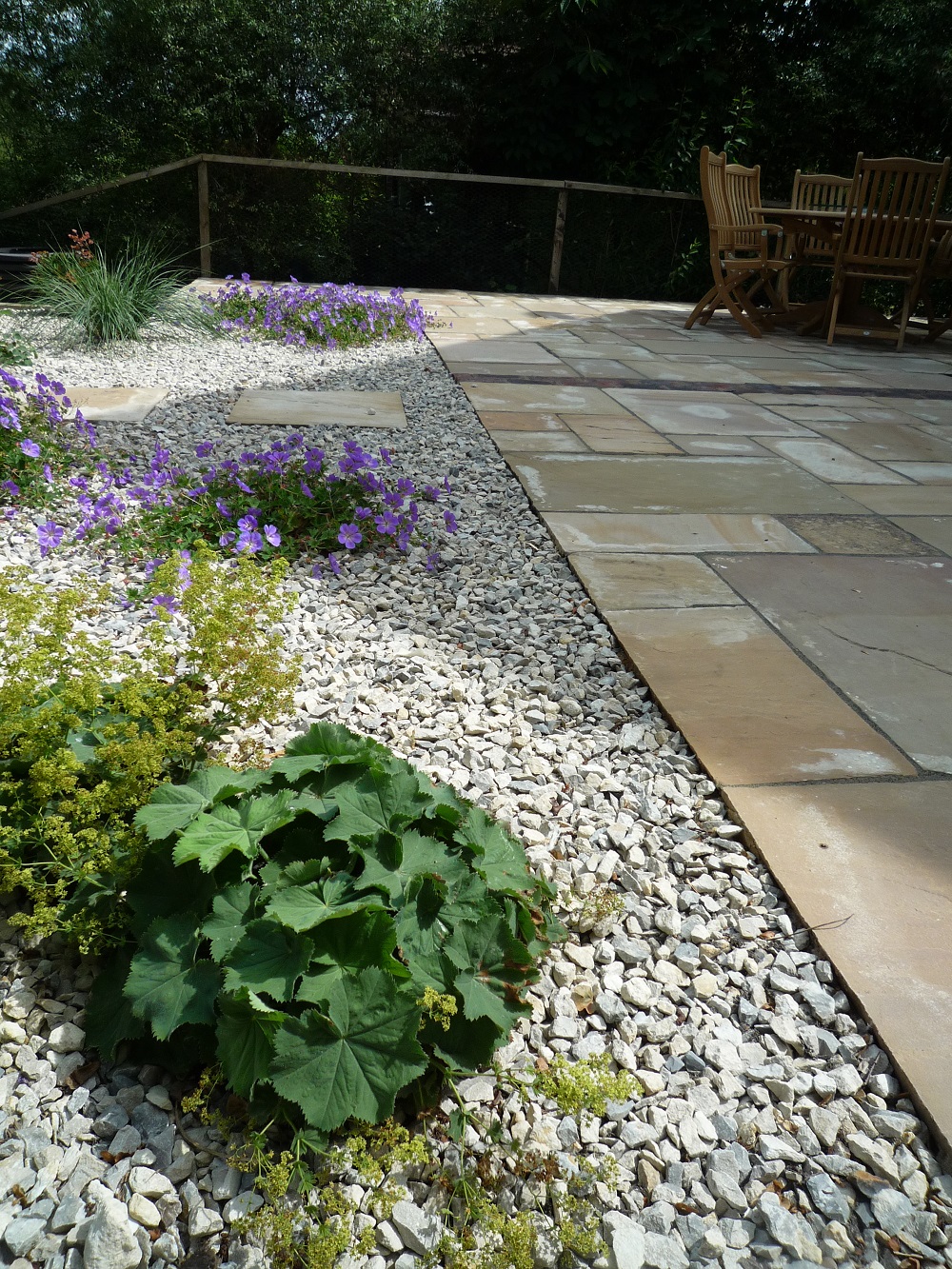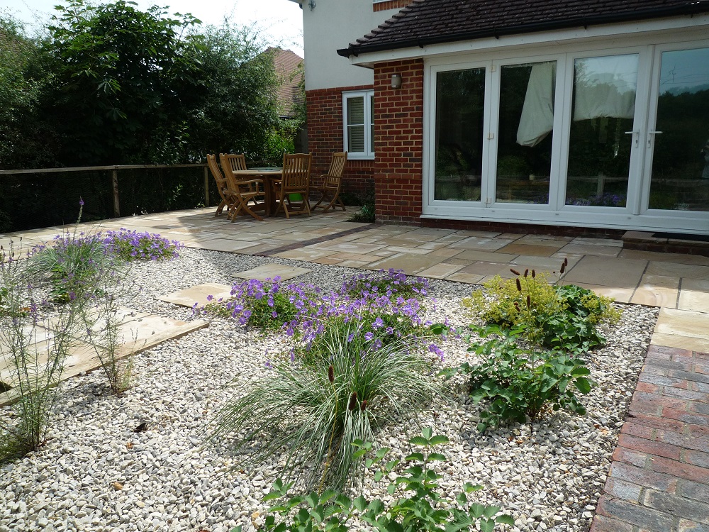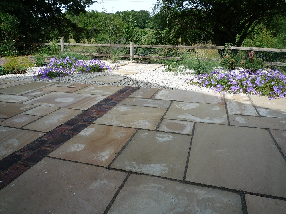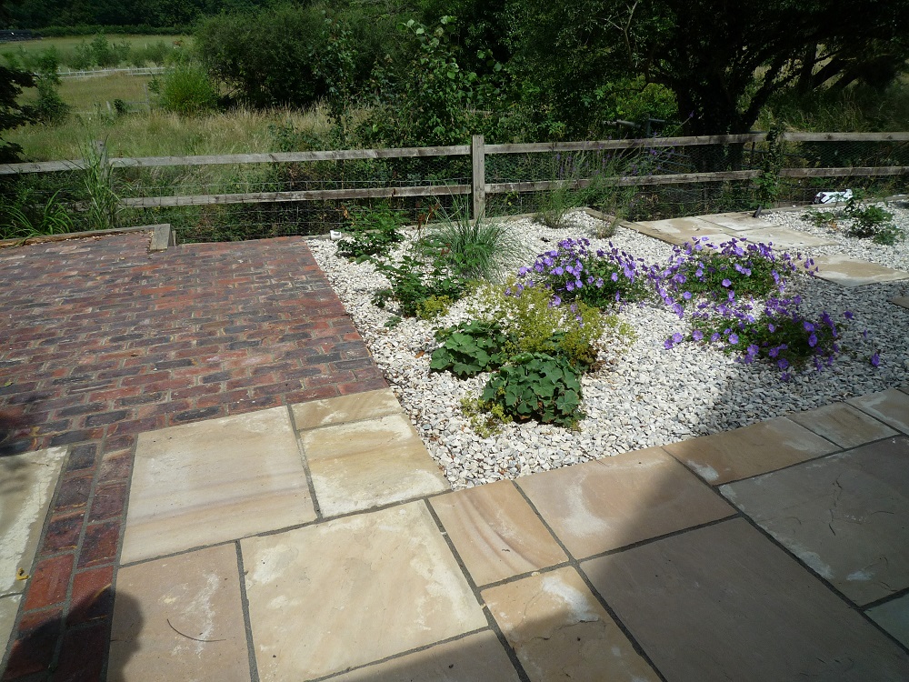 The Indian sandstone slabs were re-laid and this in itself made a huge difference. The paved area was broken up by introducing an area of bricks and the previous vegetable beds were made into a gravel garden using Purbeck Stone chippings.