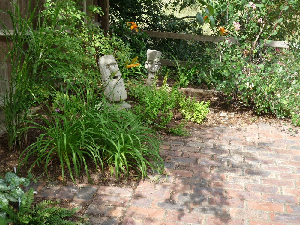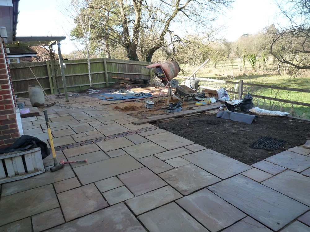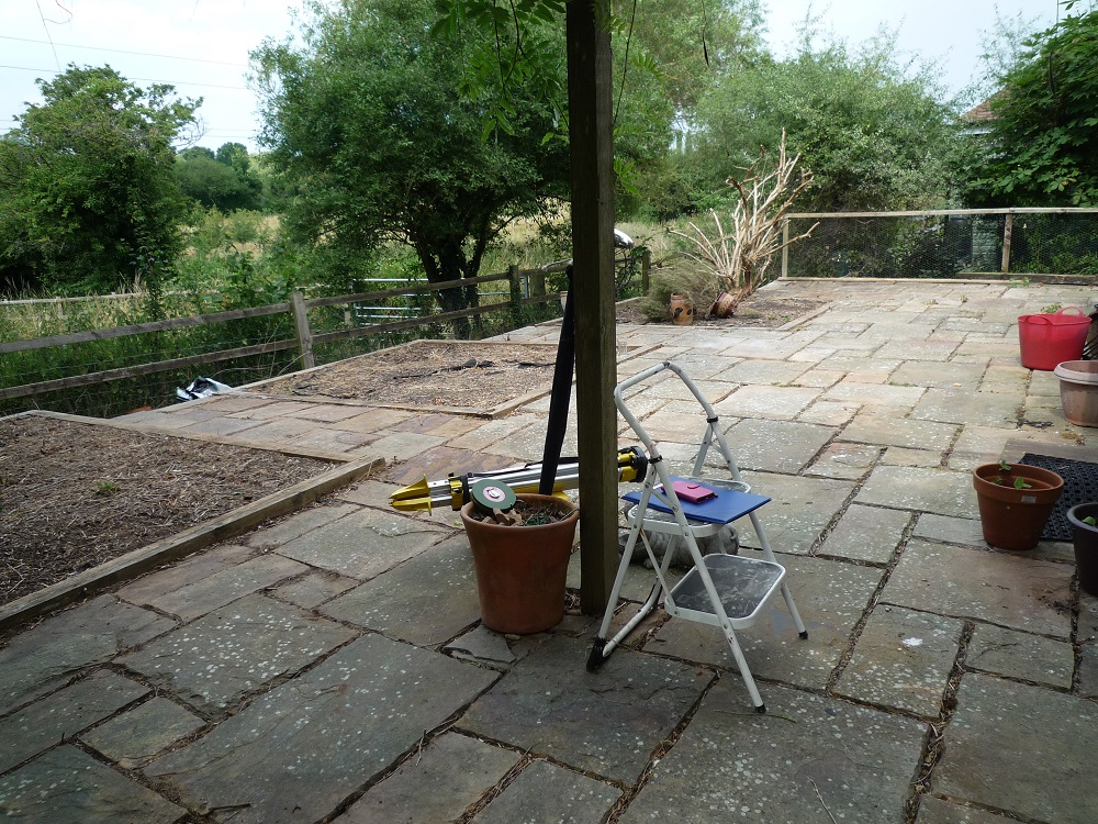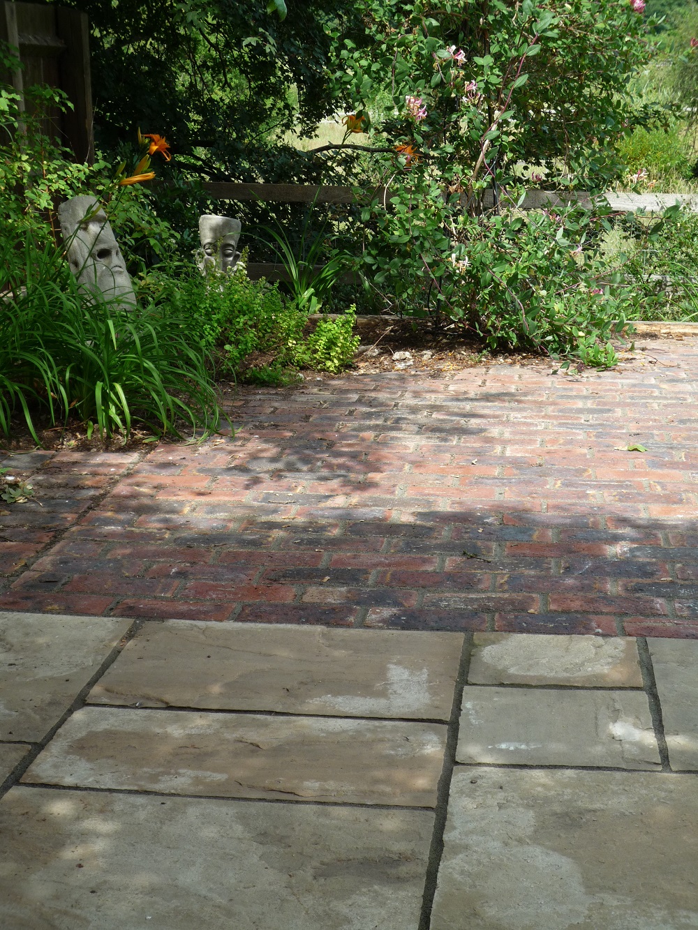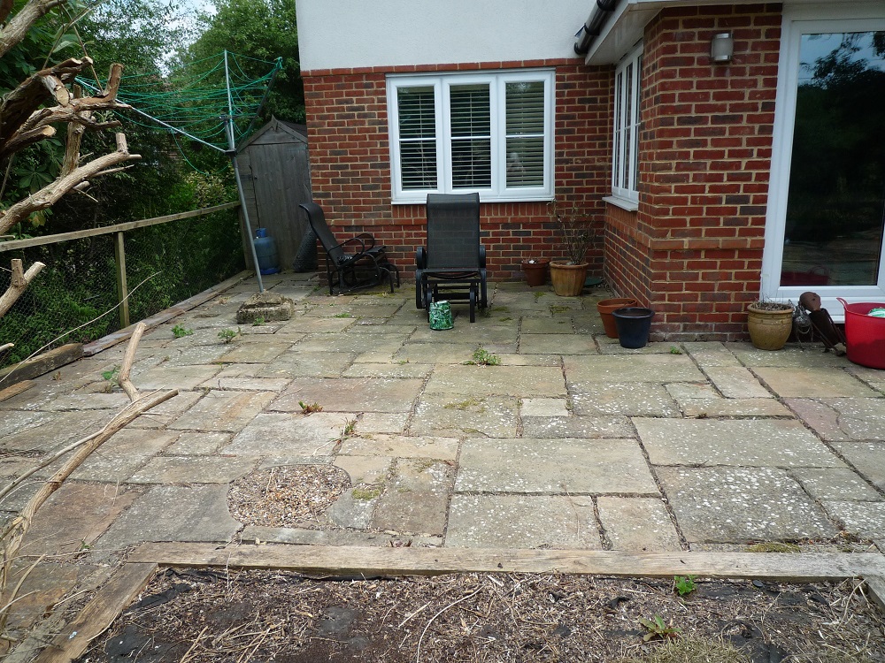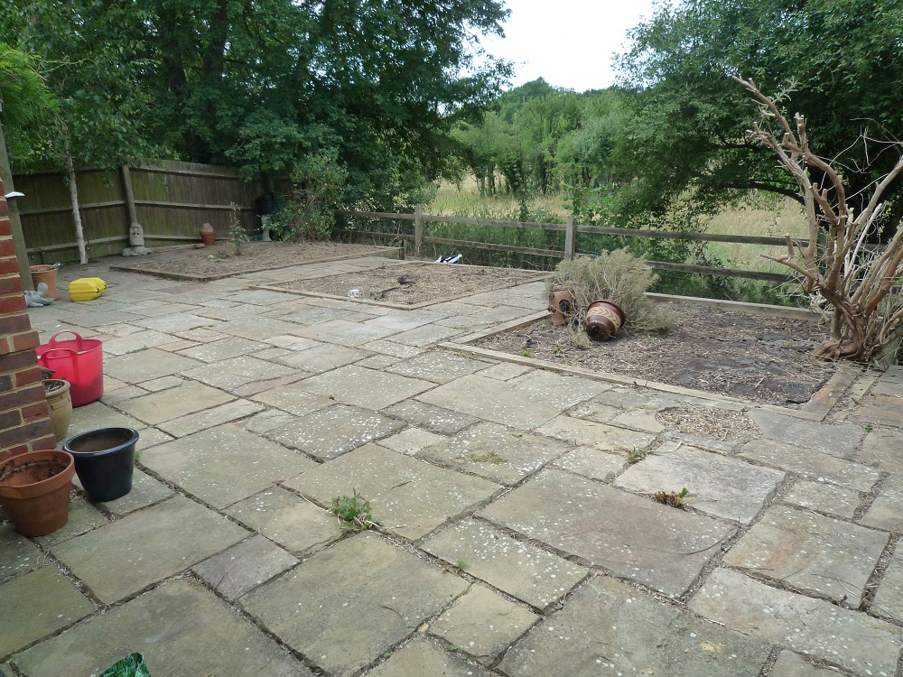 The Indian sandstone slabs were re-laid and this in itself made a huge difference. The paved area was broken up by introducing an area of bricks and the previous vegetable beds were made into a gravel garden using Purbeck Stone chippings.