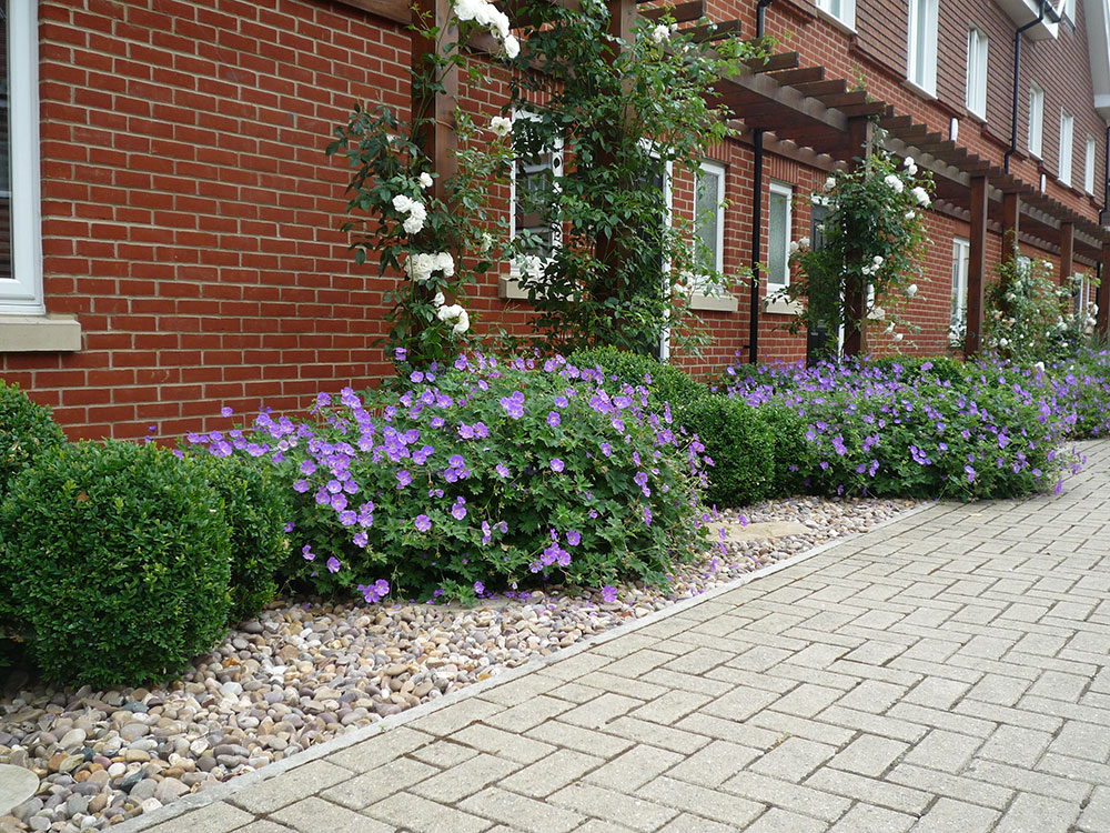 The planting consists of groups of evergreen box topiary balls, long-flowering Geranium 'Rozanne' and Rosa 'Climbing Iceberg' for the arbour. Both the Geranium and Rose flower well into November, giving great value.