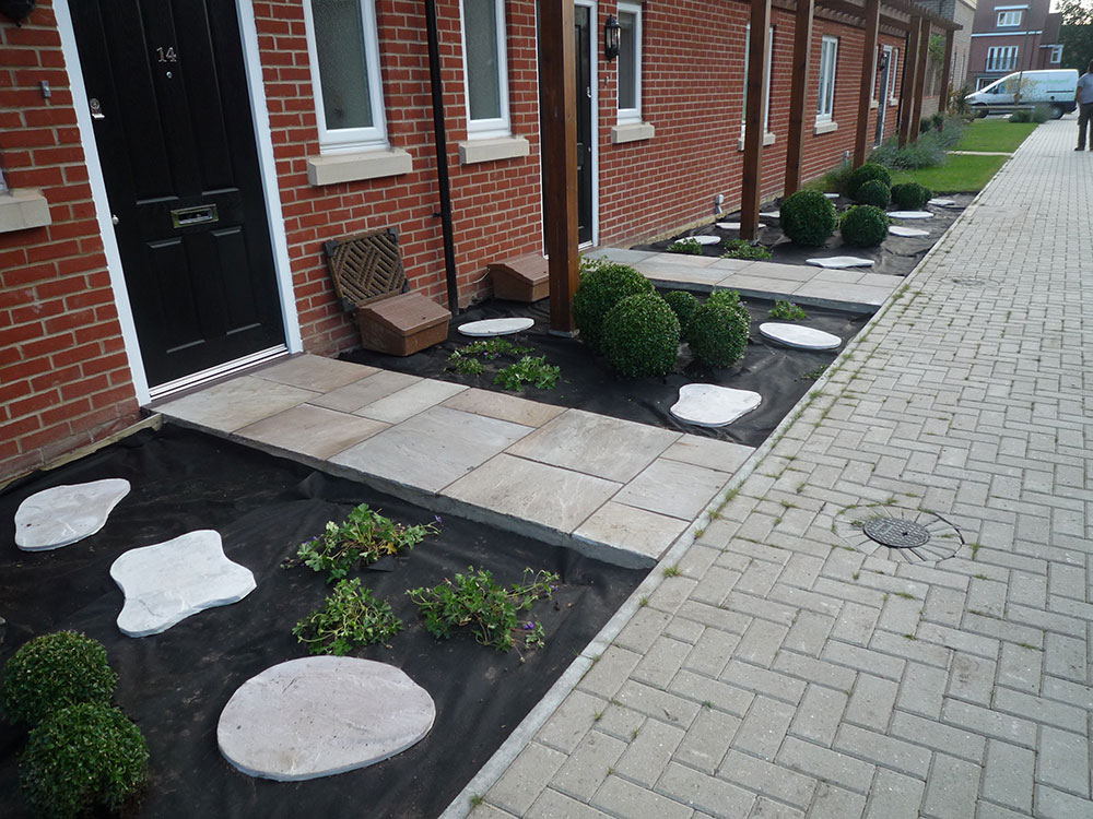 Caledonian pebbles interspersed with irregularly shaped sandstone stepping stones break up the area.