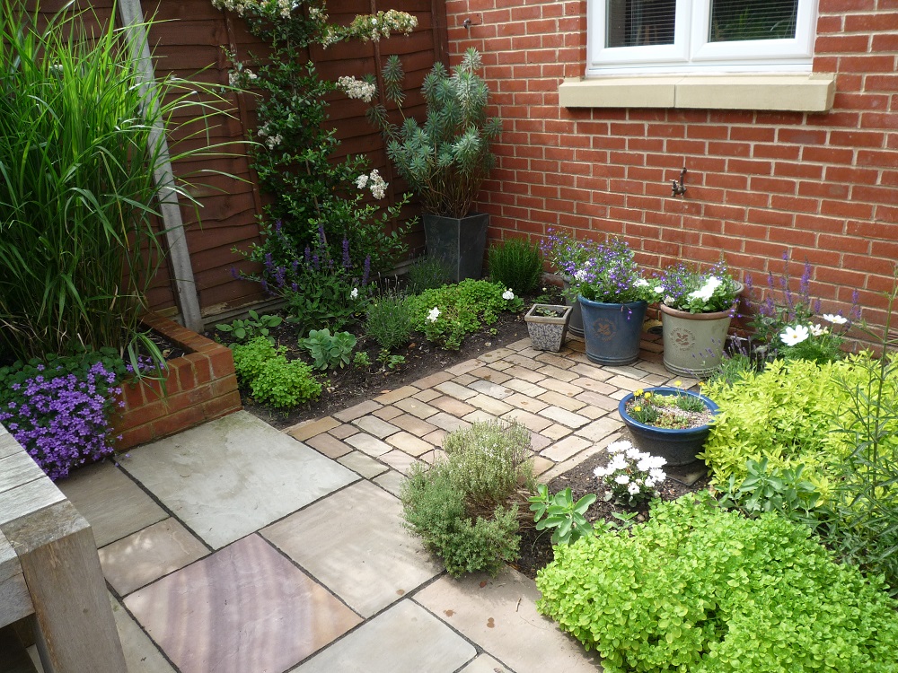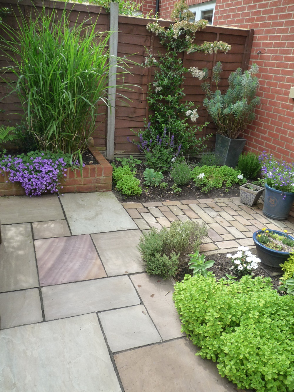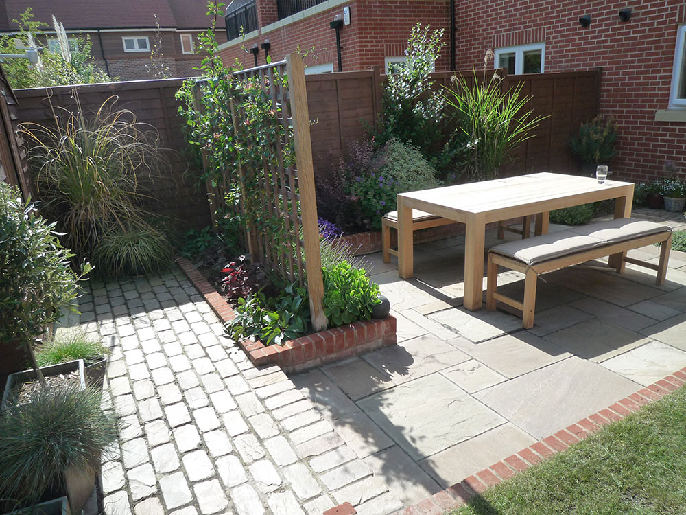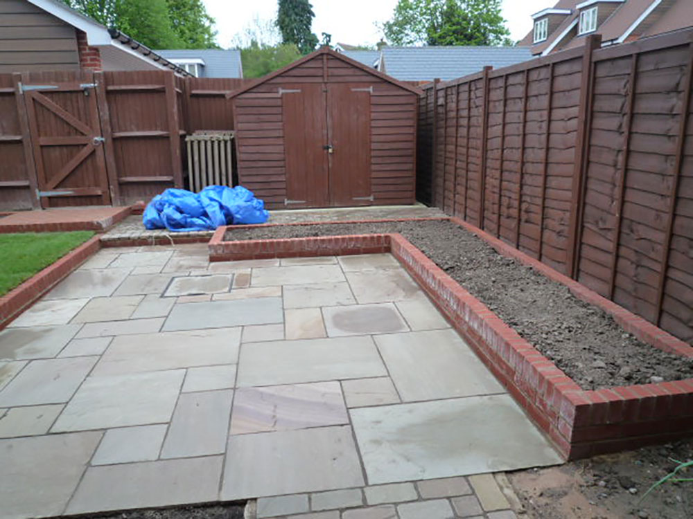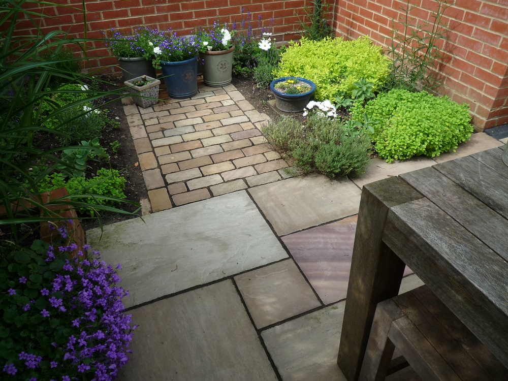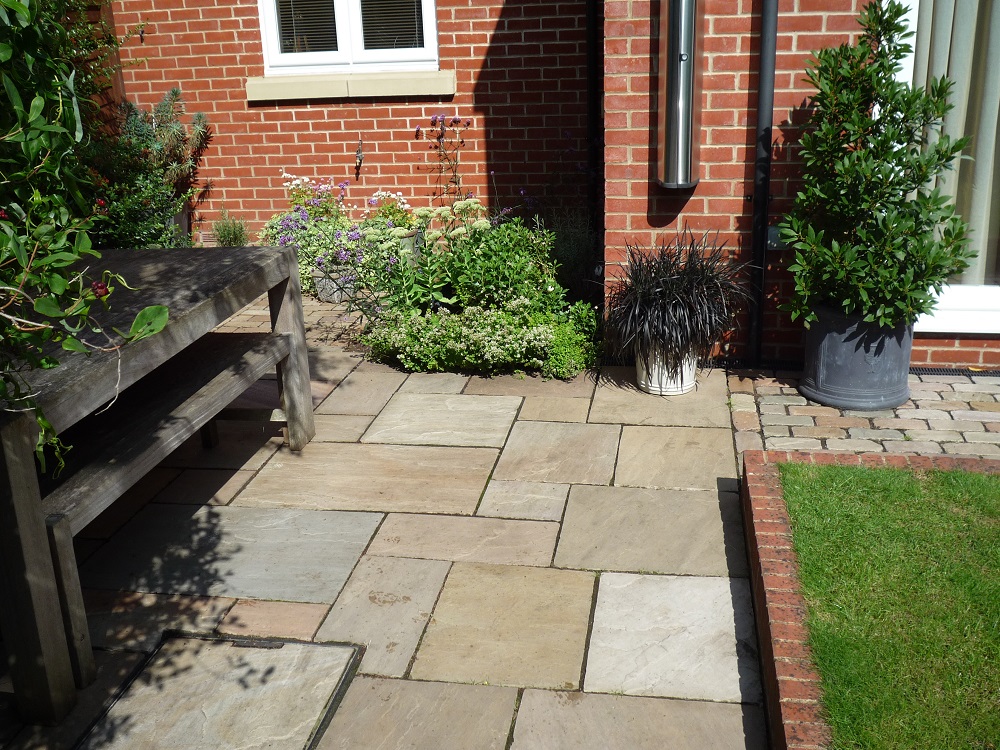 The garden had a slight slope so required steps and raised beds. Areas of tumbled Indian sandstone setts combine with a sandstone patio and brick edgings.