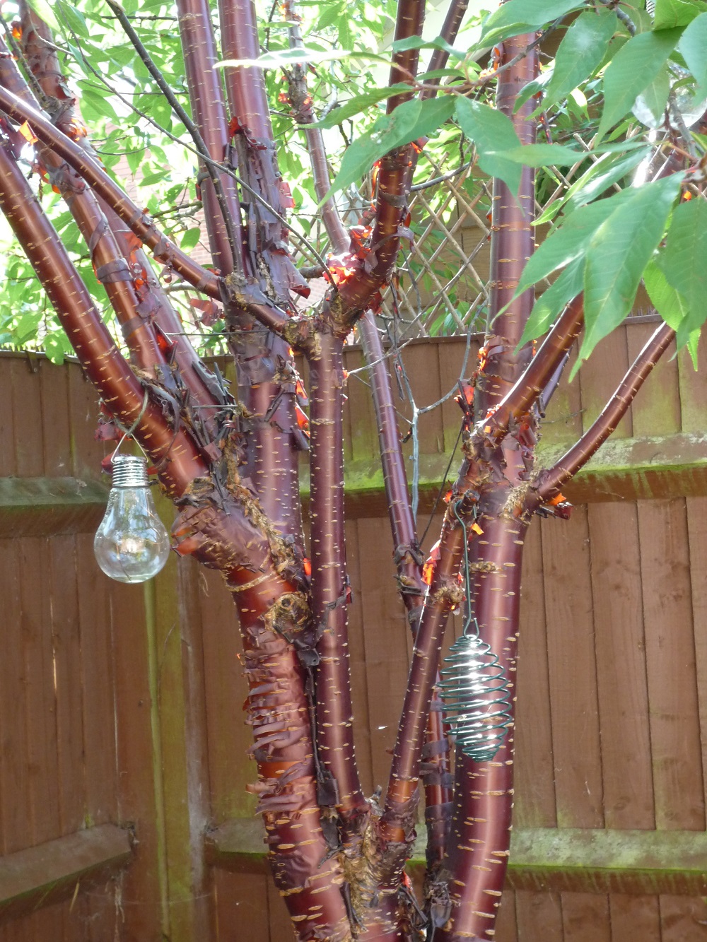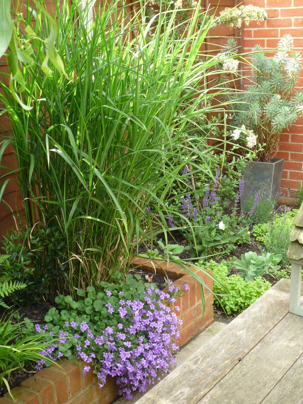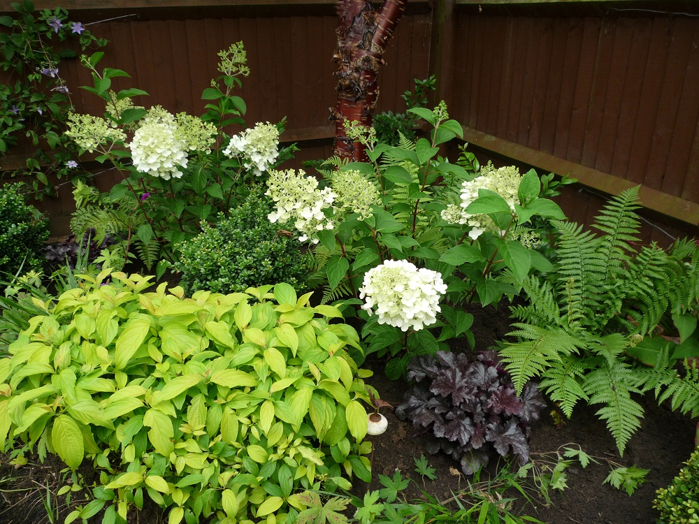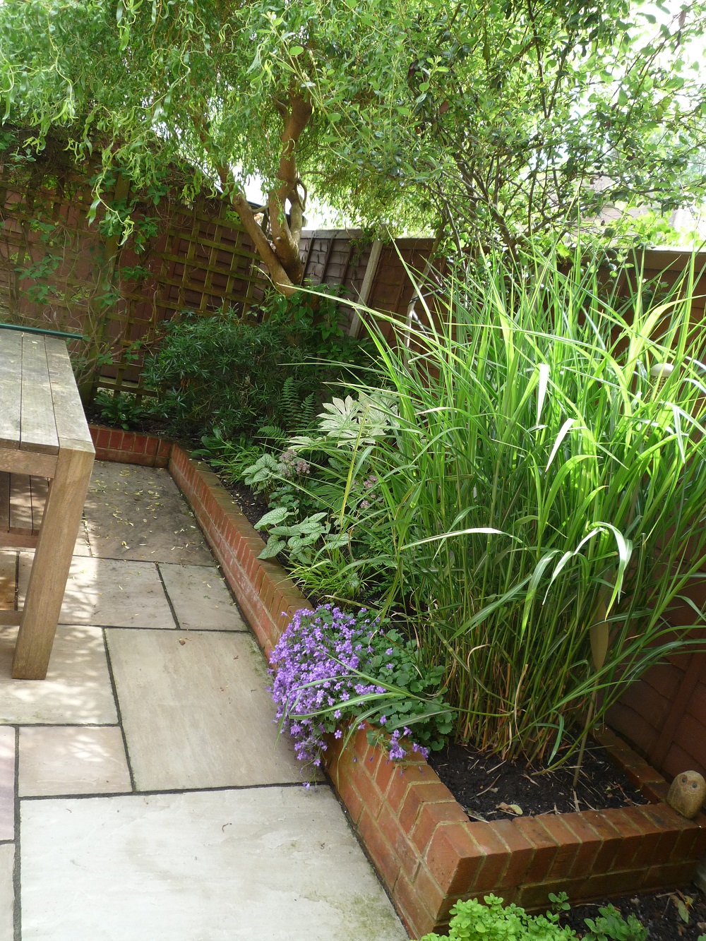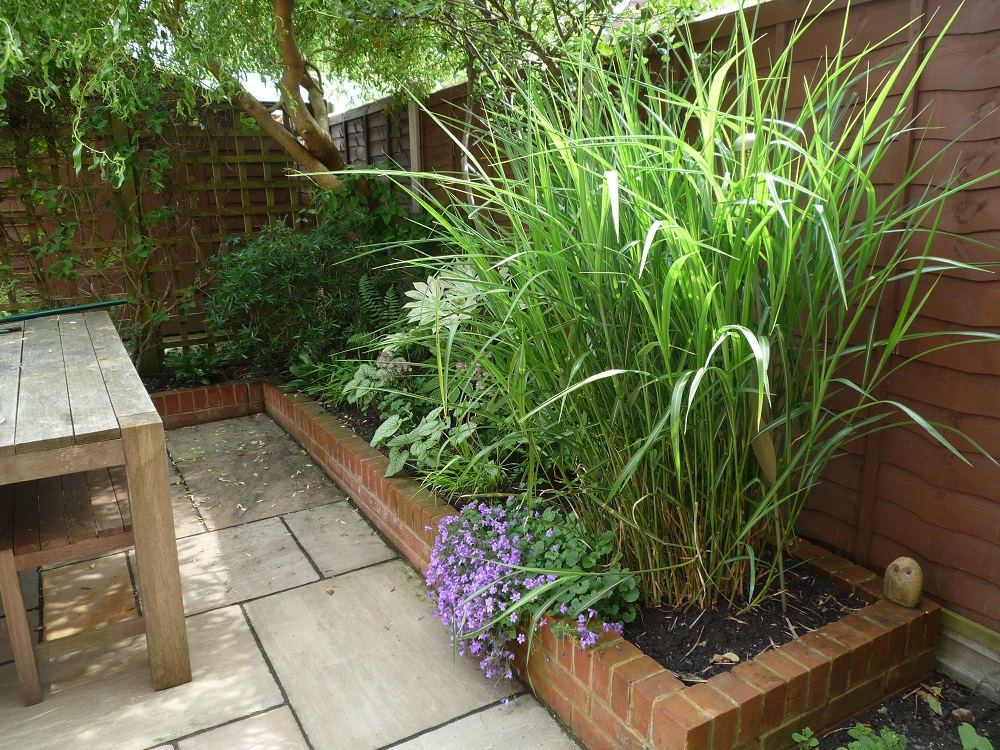Planting includes my client's own plants that had been in pots, together with a Prunus serrula tree with attractive shiny bronze bark providing screening, Hydrangeas. Persicaria and Miscanthus 'Zebrinus'.