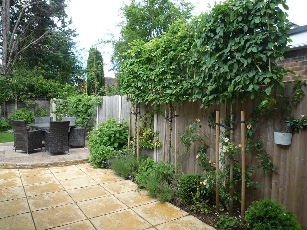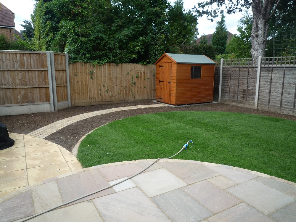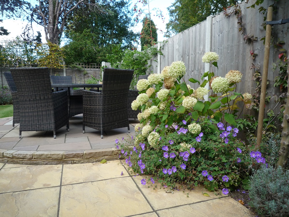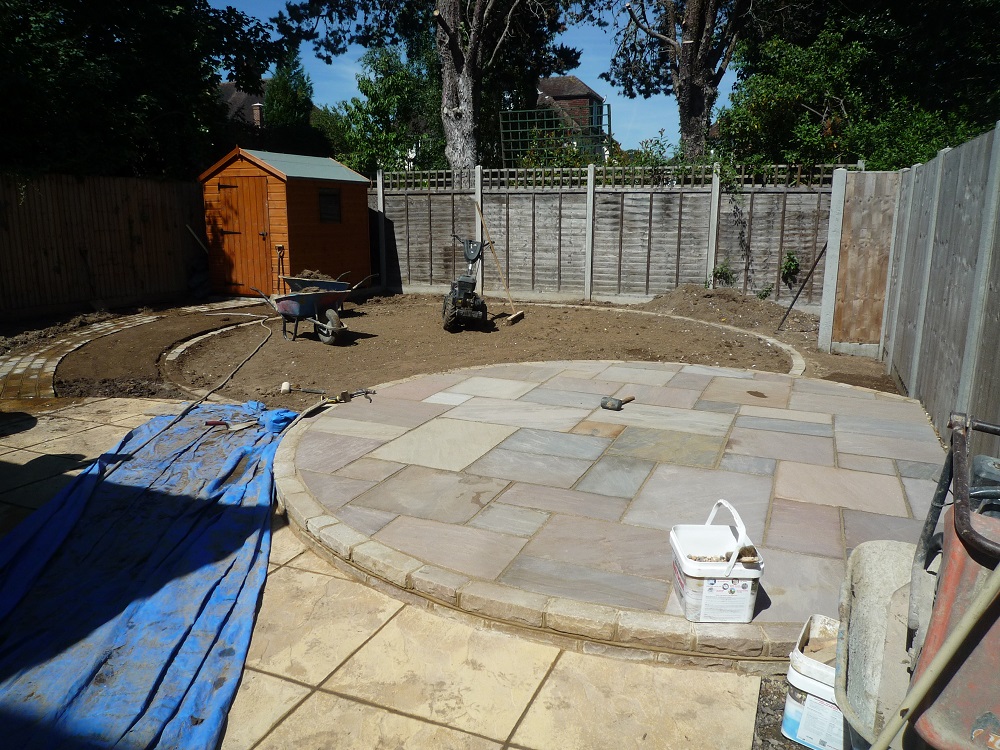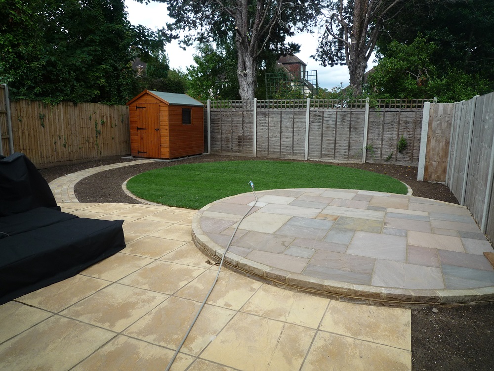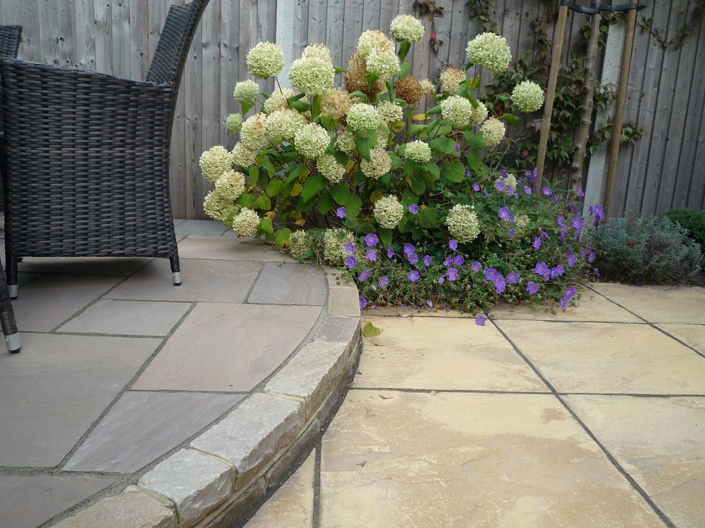 The existing new build paving was sound, and so was largely retained. It just required an additional circular area for the table and chairs in Indian sandstone to complement it. This area was raised slightly, using attractive sandstone bricks.