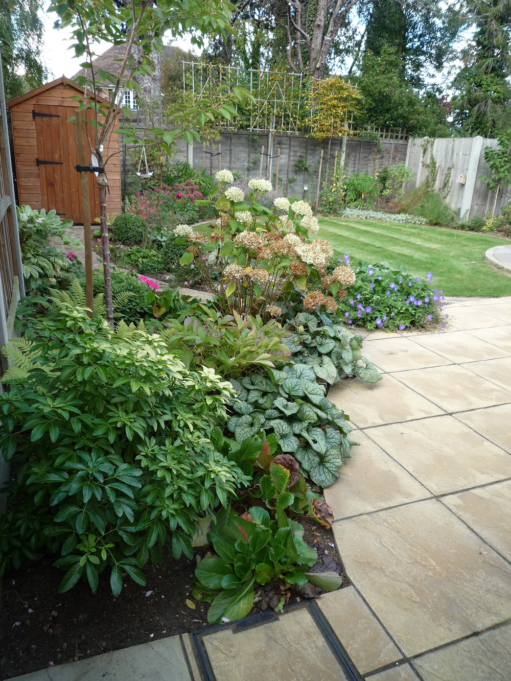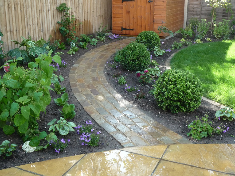 A sandstone sett path leads to the shed, edged with luxuriant planting.