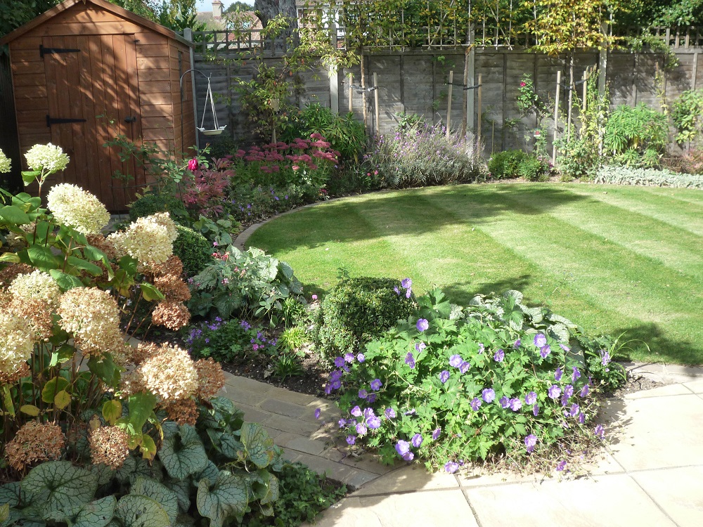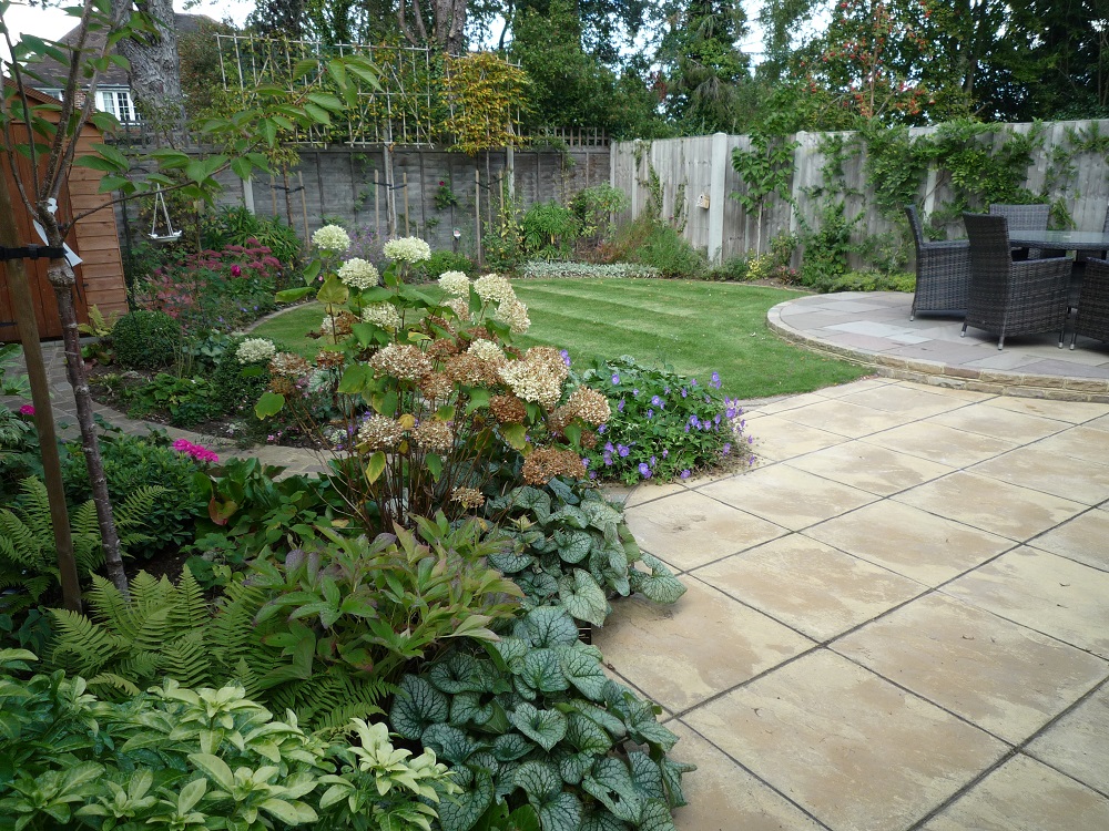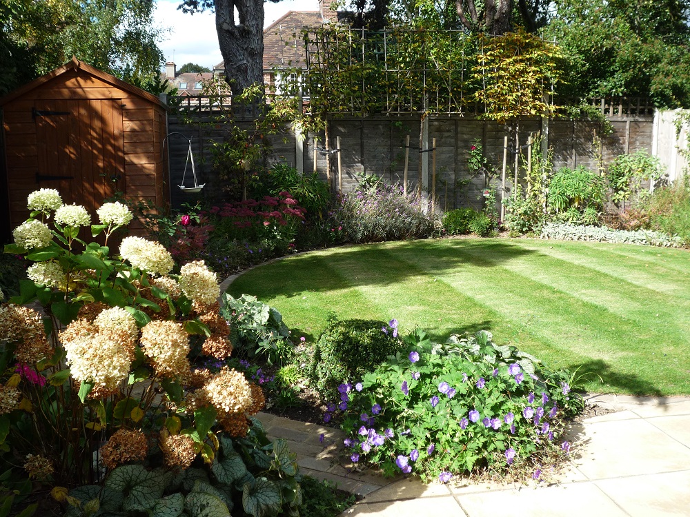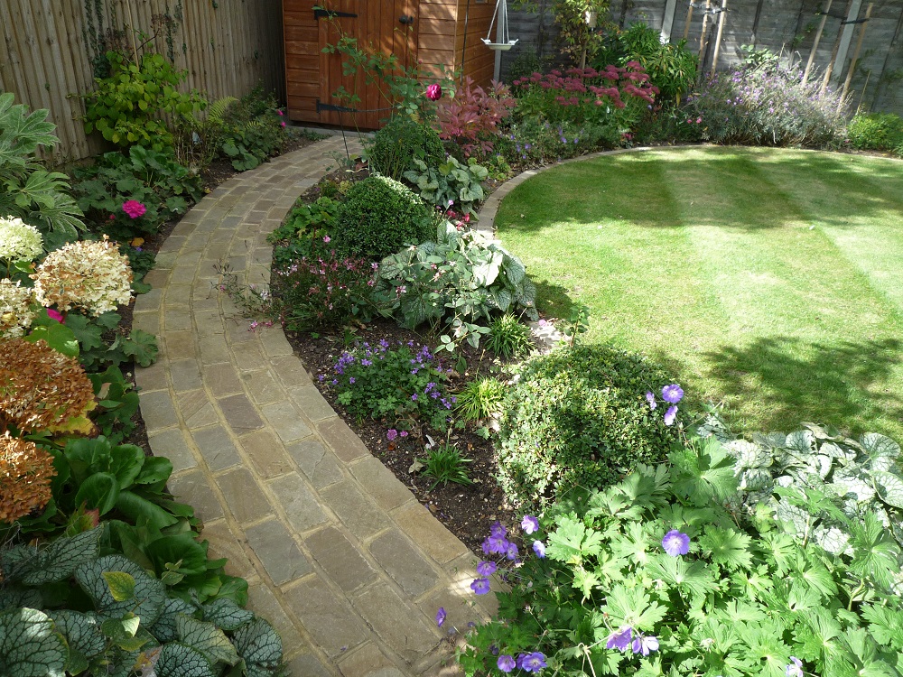The garden dipped slightly at the back, and so this area was levelled out with new topsoil. A circular design was the favourite choice which introduces movement and detracts from the squareness of the garden.