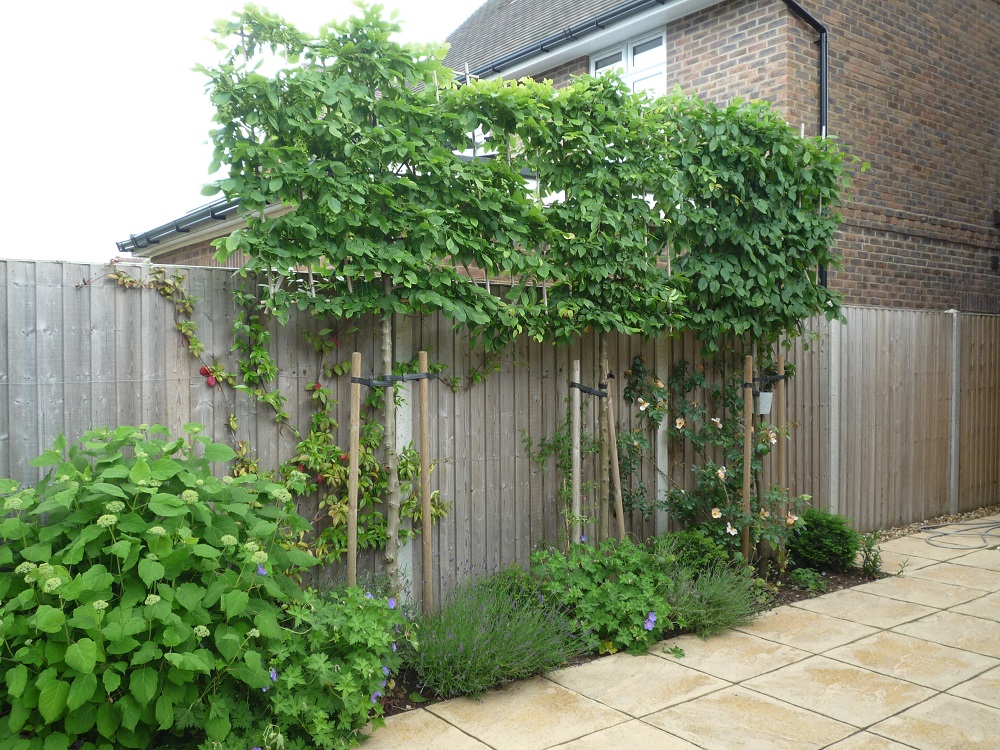 Pleached hornbeam trees were the ideal choice to give screening from the view beyond, and along with other feature trees such as a Cercis, spring flowering Cherry and white Lilac, there will be plenty to look forward to as the garden fills out. Other key plants are Hydrangea 'Annabelle', topiary Ilex crenata and Yew balls, Rosa 'Darcey Bussell' and Euphorbia mellifera.