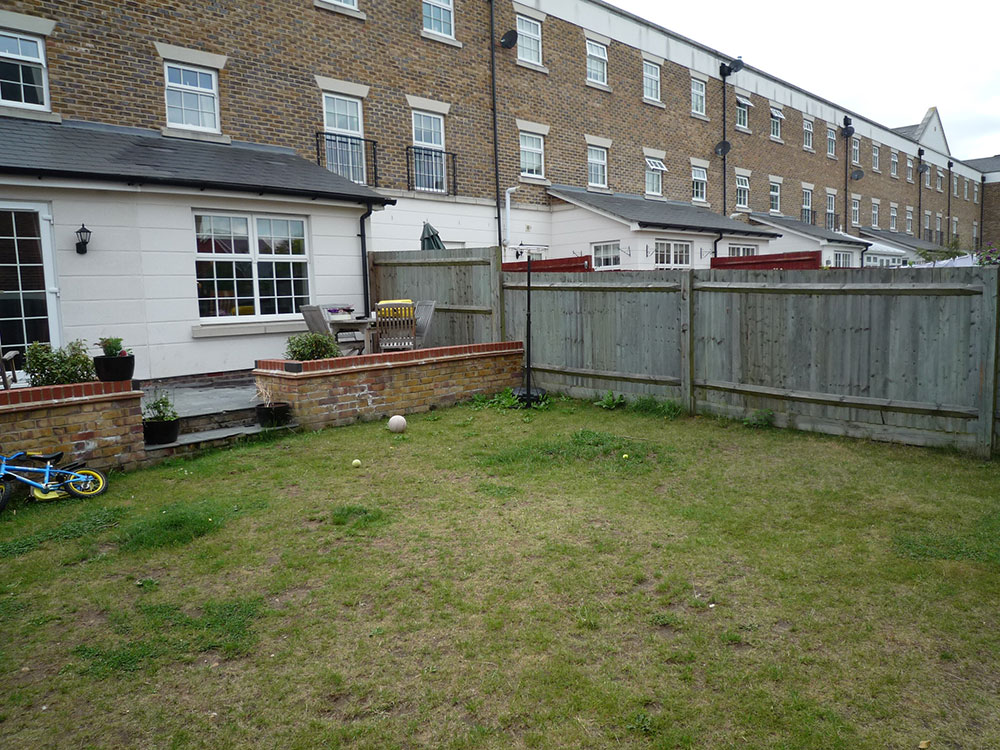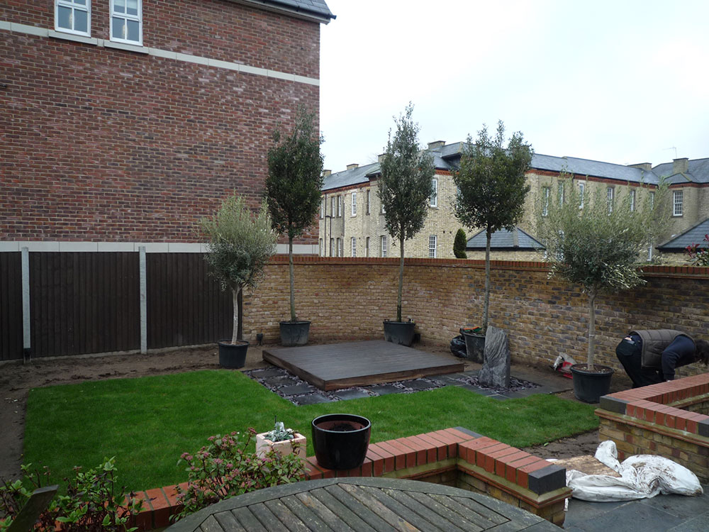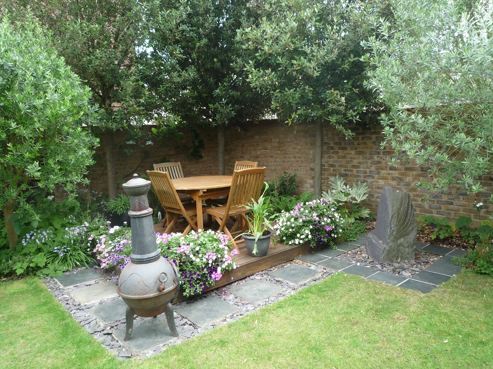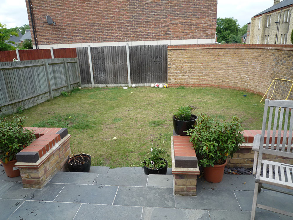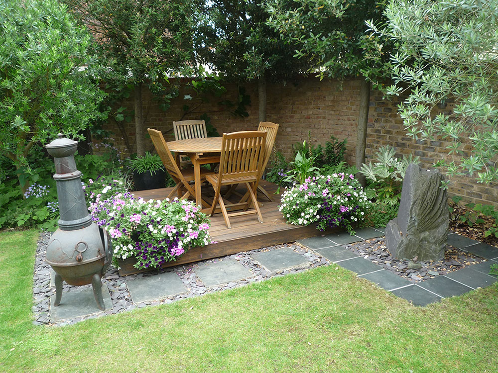 The slate path and water feature tie in with the existing slate patio near the house, and the decking provides a non- clashing contrast in materials.