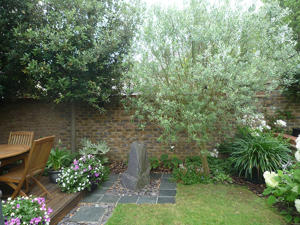 Planting around the deck began with 3 mature standard Quercus ilex (Holm or Mediterranean Oak) trees for screening. Their evergreen grey-green leaves are complemented by silvery leaved Olive trees, similarly evergreen. They have all grown very quickly and now hardly any houses beyond can be seen. The olives are healthy and hardy as it is such a sheltered spot. The oak trees form a backdrop to other more eye-catching elements in the garden in a similar way to a hedge.