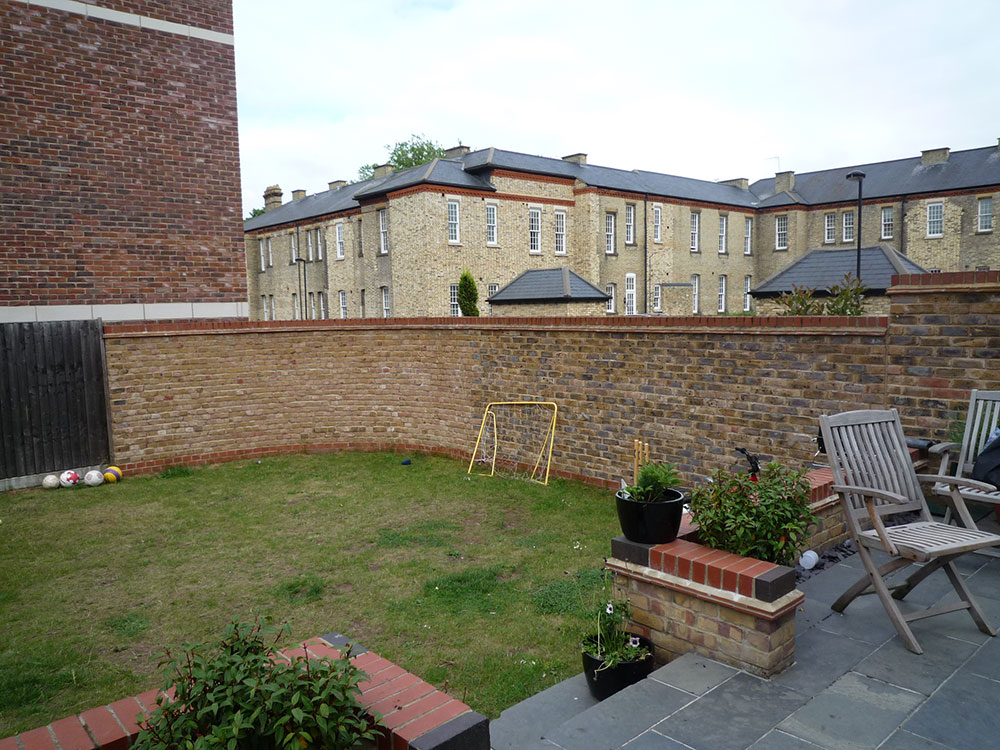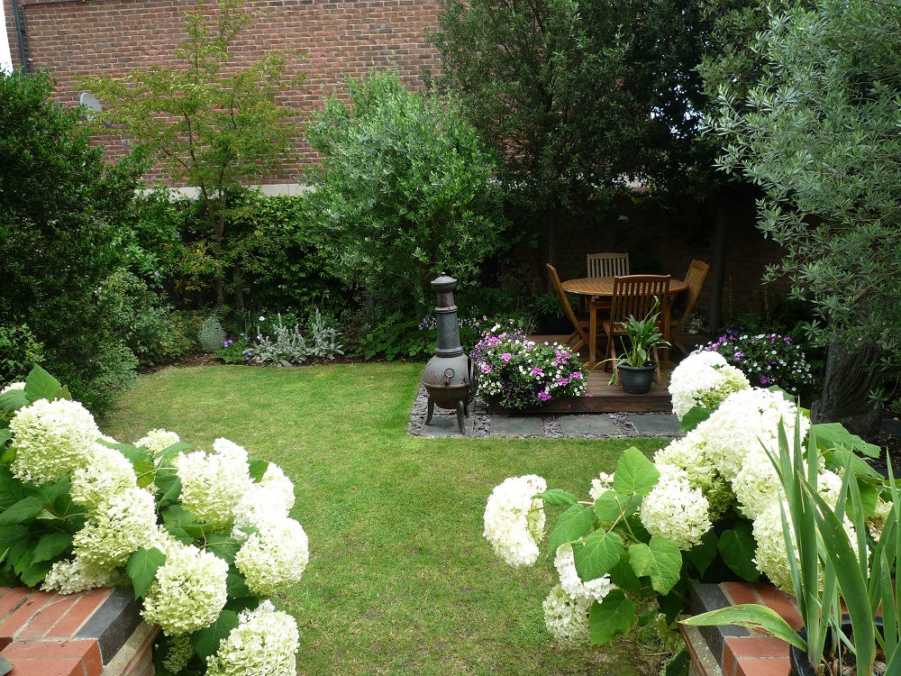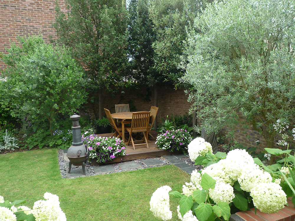 The curved brick wall was a lovely existing feature and the design was built around it. A square hardwood deck was placed in that corner to catch the evening sun.