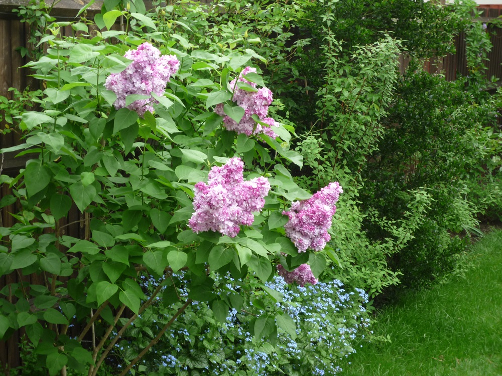 The colour palette of the planting is white, grey, blues, purples and pinks. A pale pink winter flowering cherry 'Prunus subhirtella 'Autumnalis rosea' gives long lasting flowers and more screening is supplied by azure blue flowering Ceanothus and a sugar pink Lilac.