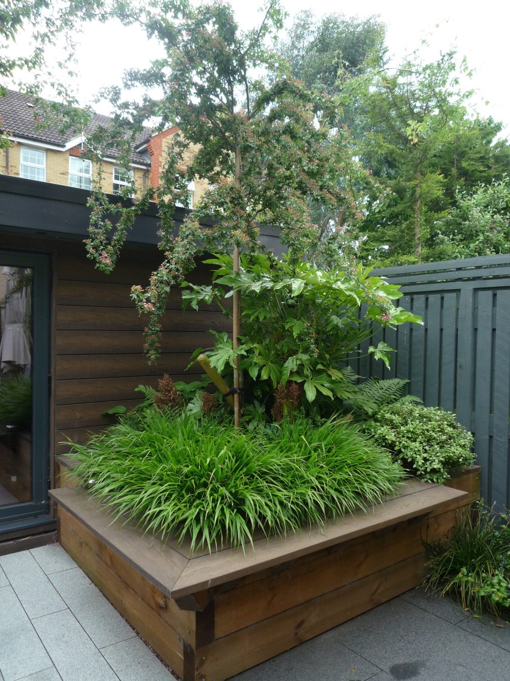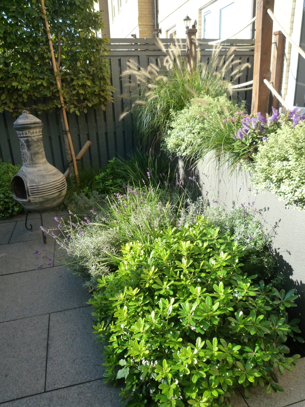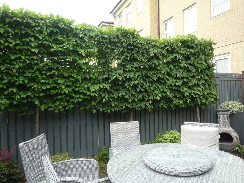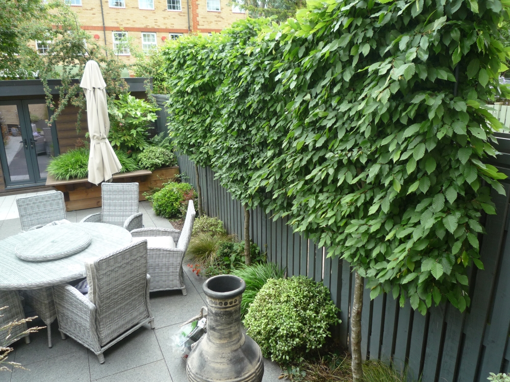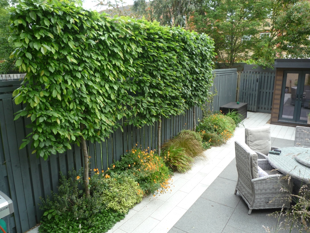Screening trees in the form of pleached hornbeams give privacy and greenery. The leaves are retained on the trees for a long period of time. Lush evergreens and grasses add to the greenery with splashes of colour arriving throughout spring and summer with geums, hemerocallis, campanula, lavender, hebes and astilbe.