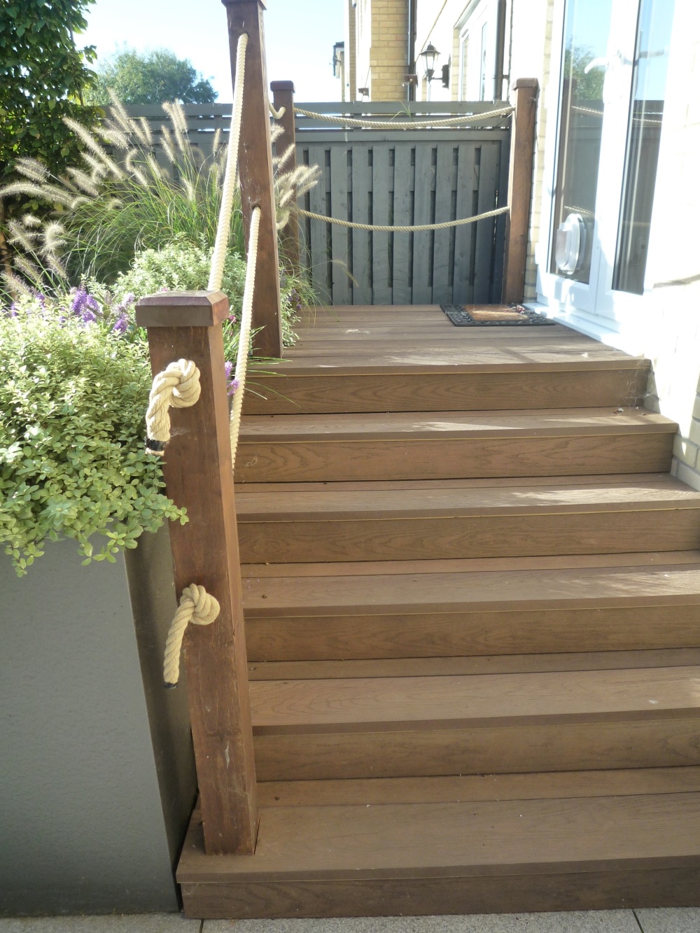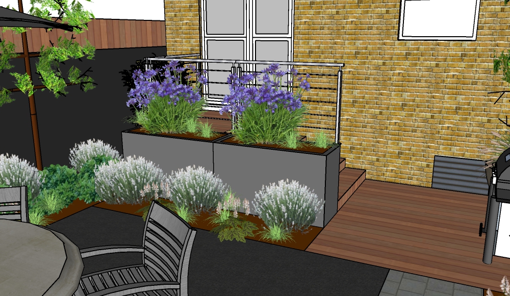 A rope balustrade proved much cheaper than a glass structure and tall troughs with planting create the barrier required to the garden below. The fences were stained a colour to match the 'metallic graphite grey' troughs, supplied by www.livingreendesign.com