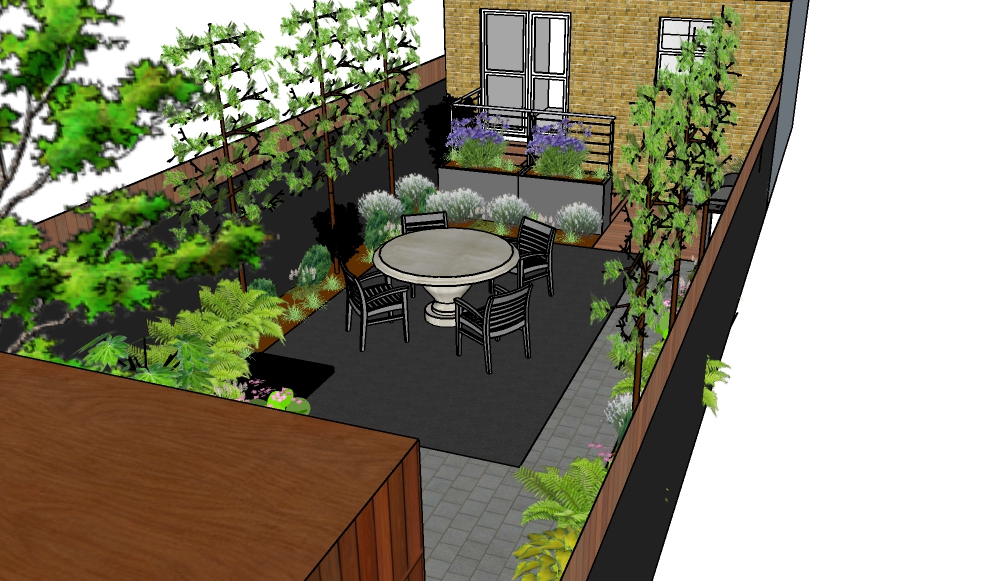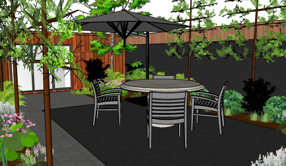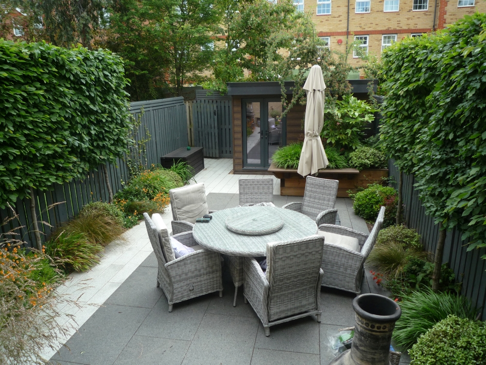 The brief was to create a low maintenance contemporary style garden with screening, space for entertaining and a new garden building.